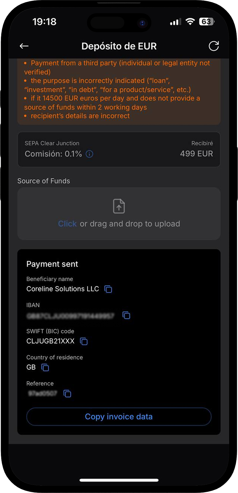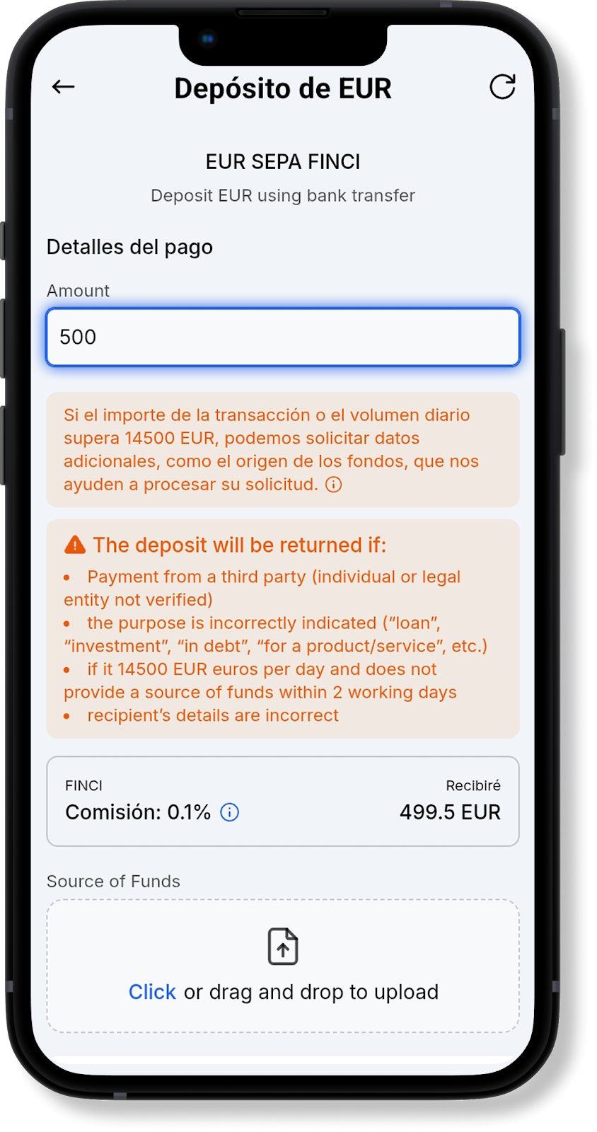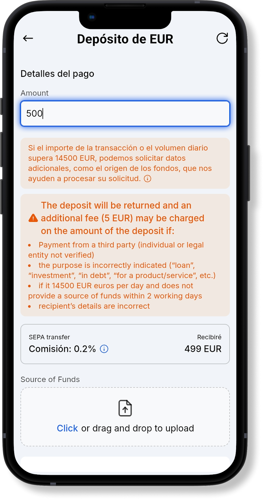 En la ventana de recarga EUR SEPA y EUR SEPA Clear Junction, verá un mensaje indicando que si la suma de la transacción o el volumen diario supera los 14 500 EUR, será necesario proporcionar un SOF (Source of Funds, o "Fuente de los Fondos"). Esto es un requisito de nuestro banco asociado. Puede ver la lista completa de documentos requeridos al pasar el cursor sobre el icono .