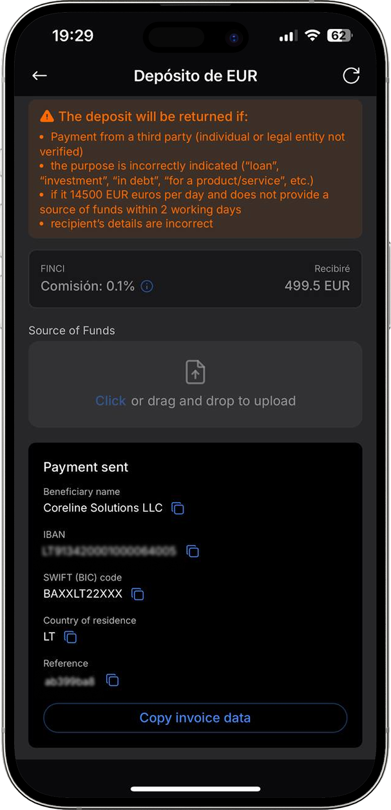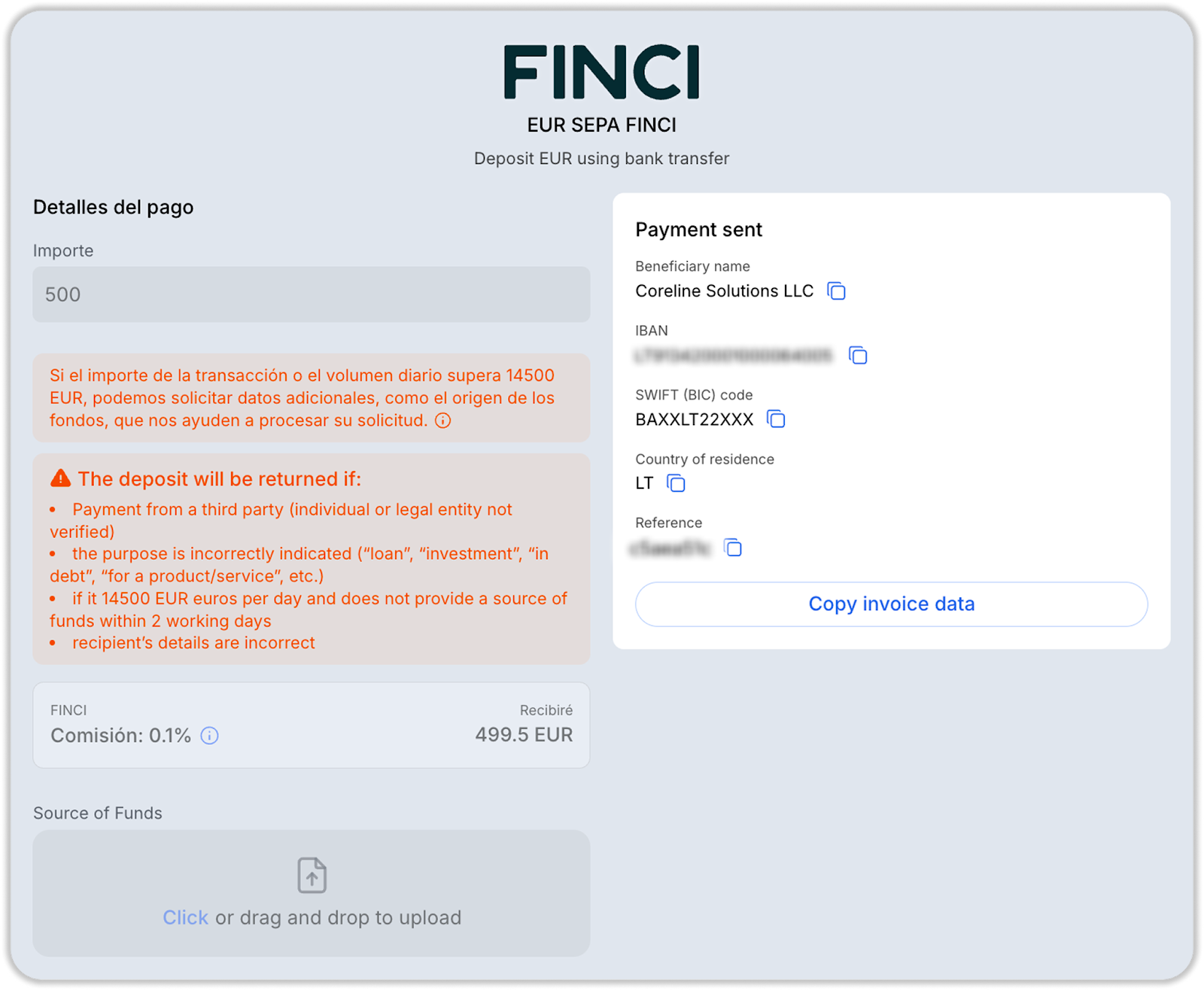 Tenga en cuenta: al depositar mediante el método FINCI, se utiliza un único IBAN para todos los usuarios — LT913420001000064005, perteneciente a Coreline Solutions LLC.