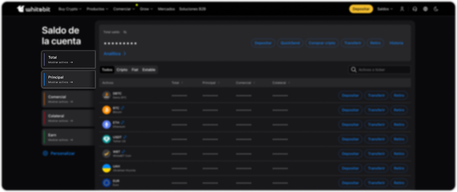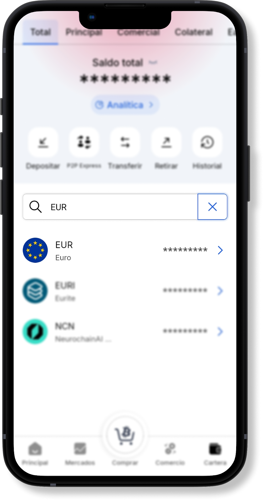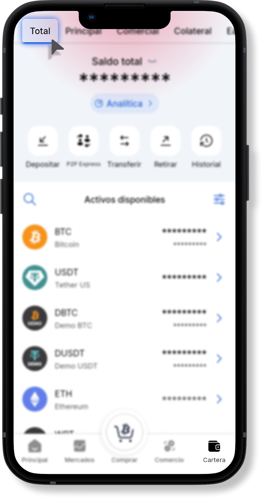 En la página principal de la aplicación móvil, seleccione la pestaña "Billetera" y vaya a la sección de balances "Total" o "Principal".