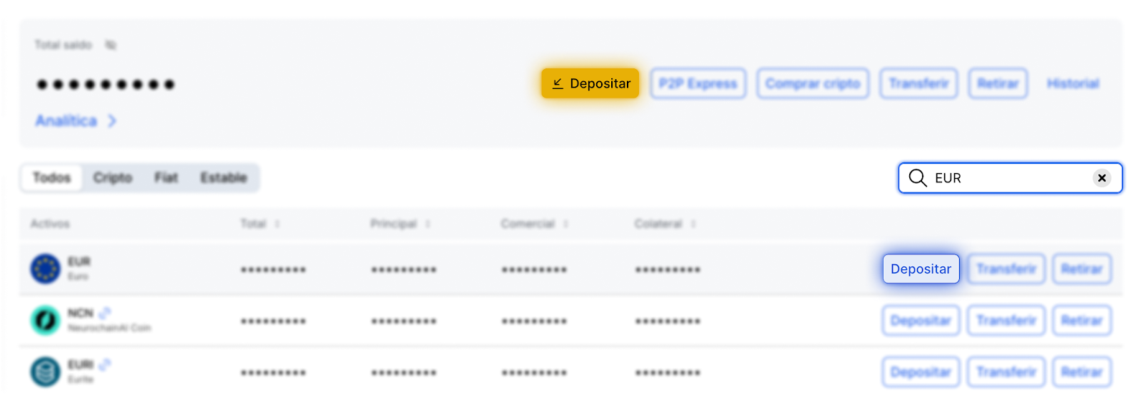 Busque la moneda con el ticker "EUR" y haga clic en el botón "Depositar" o seleccione la función "Depositar" y EUR en la lista de monedas.
