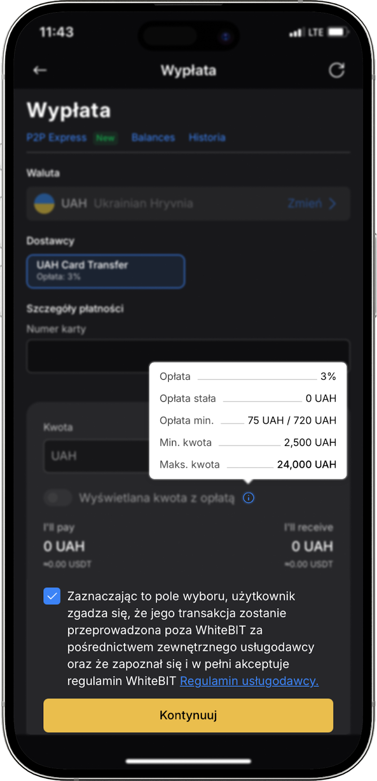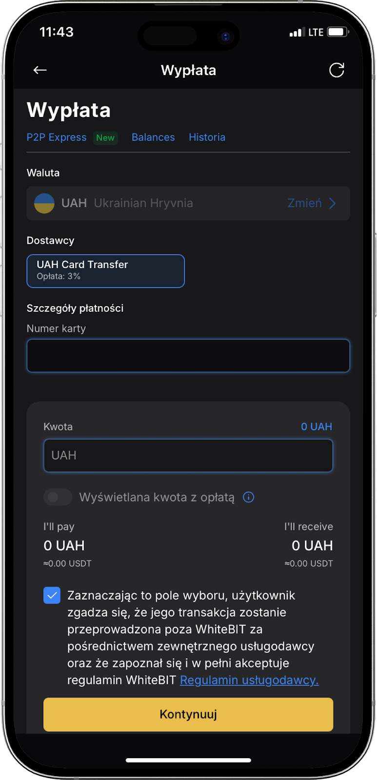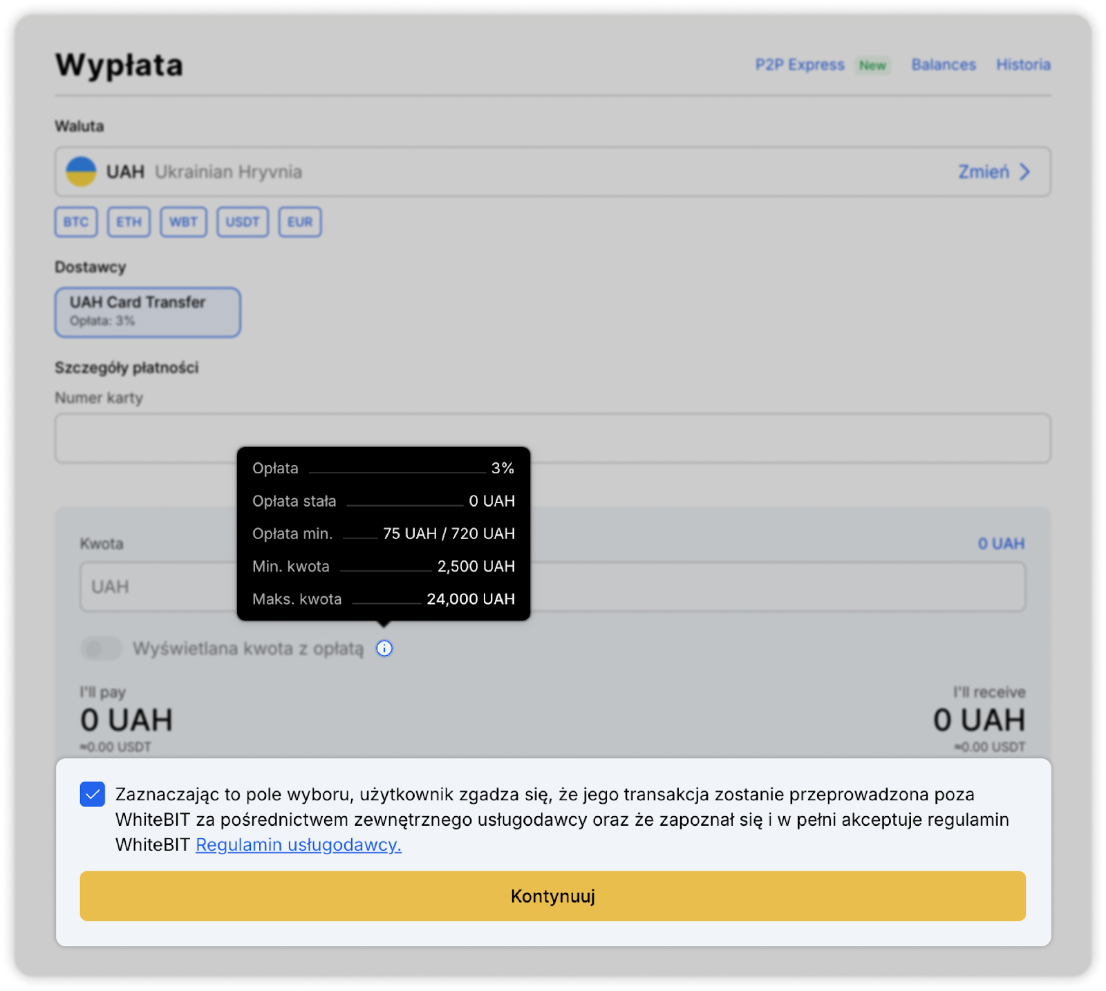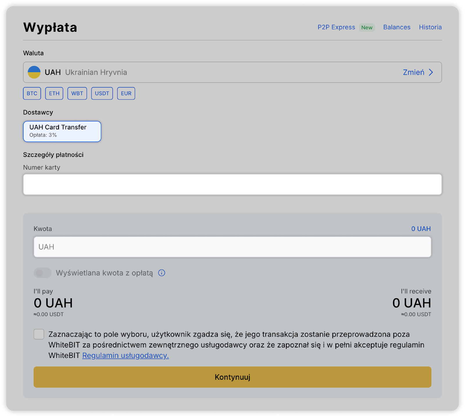 Zaznacz pole, które wskazuje, że transakcja zostanie wykonana poza WhiteBIT przez zewnętrznego dostawcę usług. Następnie kliknij przycisk „Kontynuuj” i potwierdź transakcję.