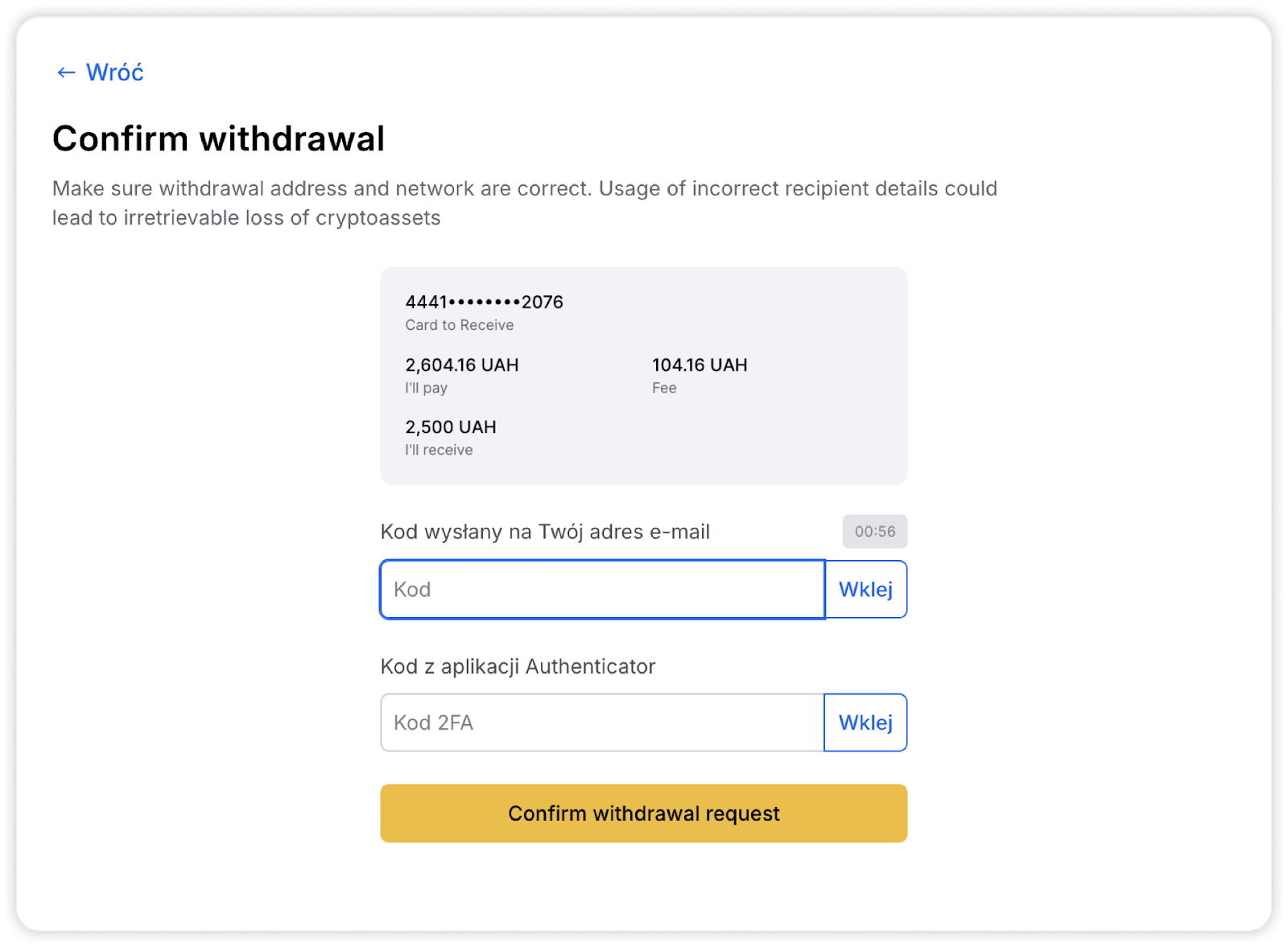Zwróć uwagę, że aby potwierdzić wypłatę środków, należy wprowadzić kod weryfikacyjny, który zostanie wysłany na Twój e-mail. Kod ten będzie ważny przez 180 sekund. Jeśli na twoim koncie włączone jest uwierzytelnianie dwuskładnikowe, konieczne będzie również wprowadzenie kodu 2FA z aplikacji.
