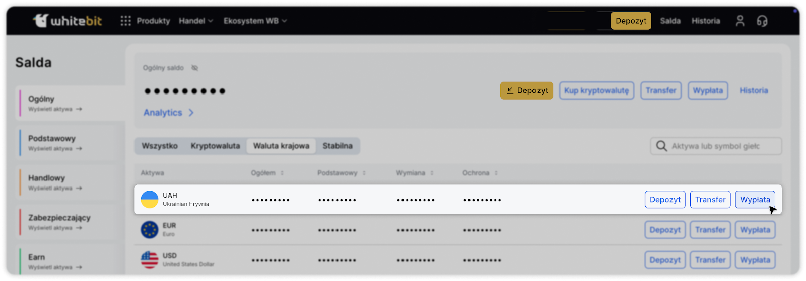Znajdź na liście hrywnę lub wpisz ticker UAH w polu wyszukiwania. Kliknij przycisk „Wypłać” po prawej stronie tickera waluty.