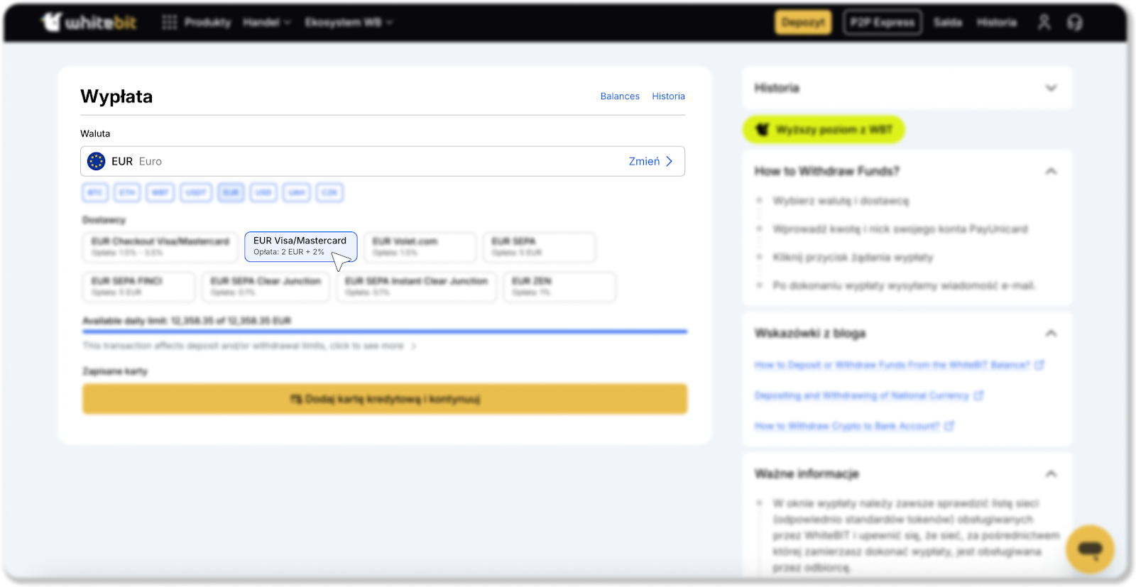 Aktualne prowizje oraz minimalne i maksymalne kwoty do wypłaty można sprawdzić na odpowiedniej stronie lub bezpośrednio w oknie wypłaty. Aby uzyskać bardziej szczegółowe informacje dotyczące prowizji, zalecamy zapoznanie się z artykułem w naszym Centrum Wsparcia.