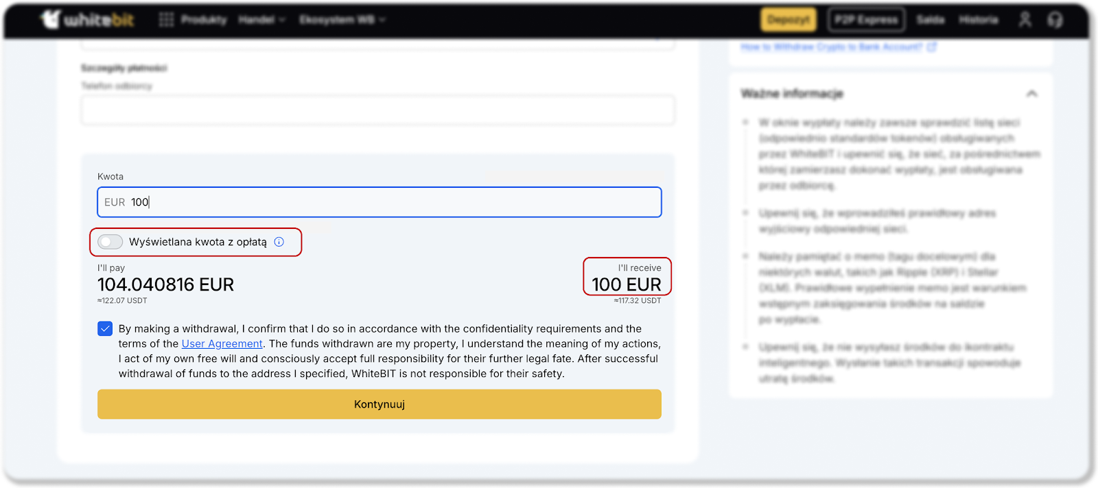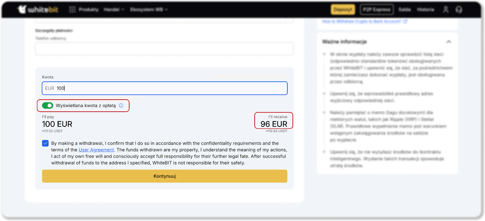 Zwróć uwagę: przełącznik „Pokaż kwotę z prowizją” określa, jaką kwotę otrzyma odbiorca w zależności od kwoty pobieranej z salda: