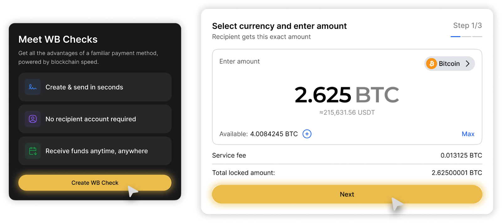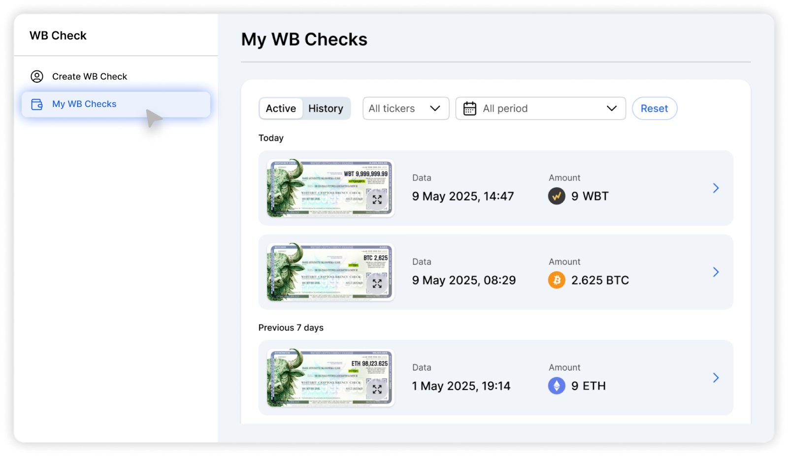 3 - Kliknij „Utwórz WB Check” i wybierz kryptowalutę z listy obsługiwanych aktywów, a następnie ustaw kwotę czeku;