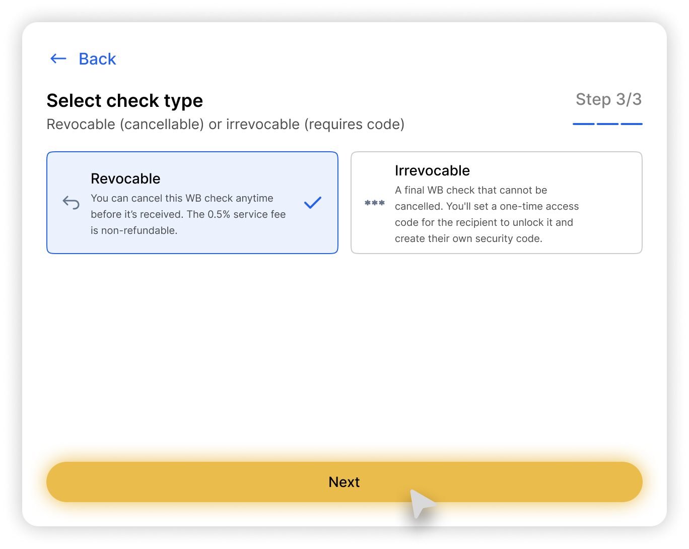 Uwaga: możesz otrzymać tylko tę samą kryptowalutę, która została wysłana w WB Check, a opłata sieciowa zostanie potrącona z całkowitej kwoty czeku.