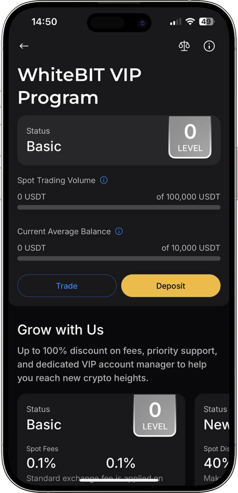 Tutaj możesz sprawdzić swój obecny poziom konta, wolumen handlu spotowego i średnie saldo. Możesz także przejść do strony handlu i doładować saldo. Dodatkowo znajdziesz warunki i krótki opis programu VIP. Więcej o programie VIP przeczytasz w naszym artykule.