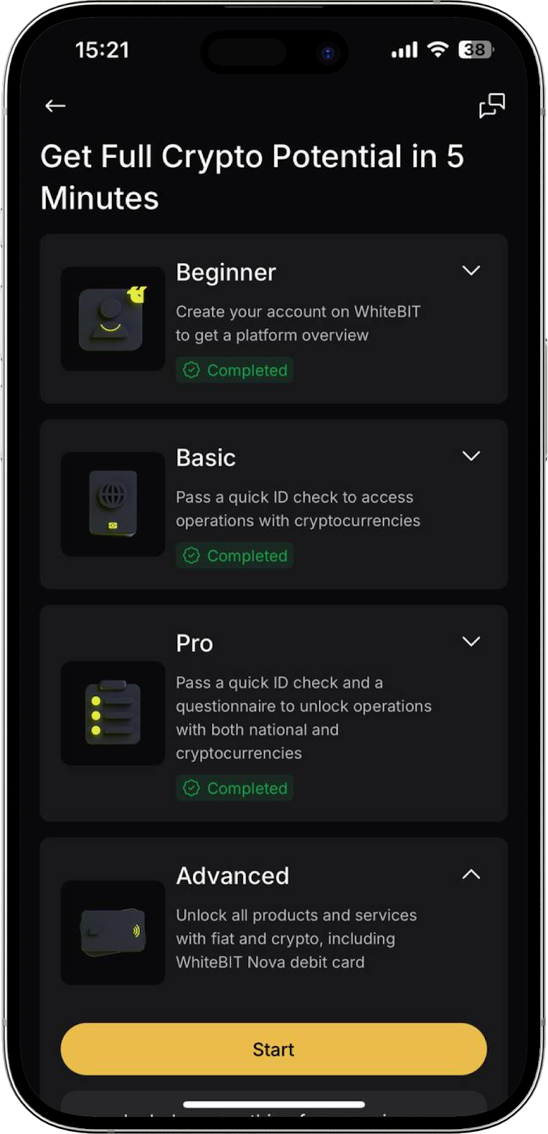 Klikając w sekcję „Weryfikacja”, możesz sprawdzić swój aktualny status weryfikacji KYC, dostępne poziomy i ich krótki opis. W tej samej sekcji możesz rozpocząć weryfikację dla wybranego poziomu. Więcej o weryfikacjach KYC przeczytasz w Centrum Wsparcia.