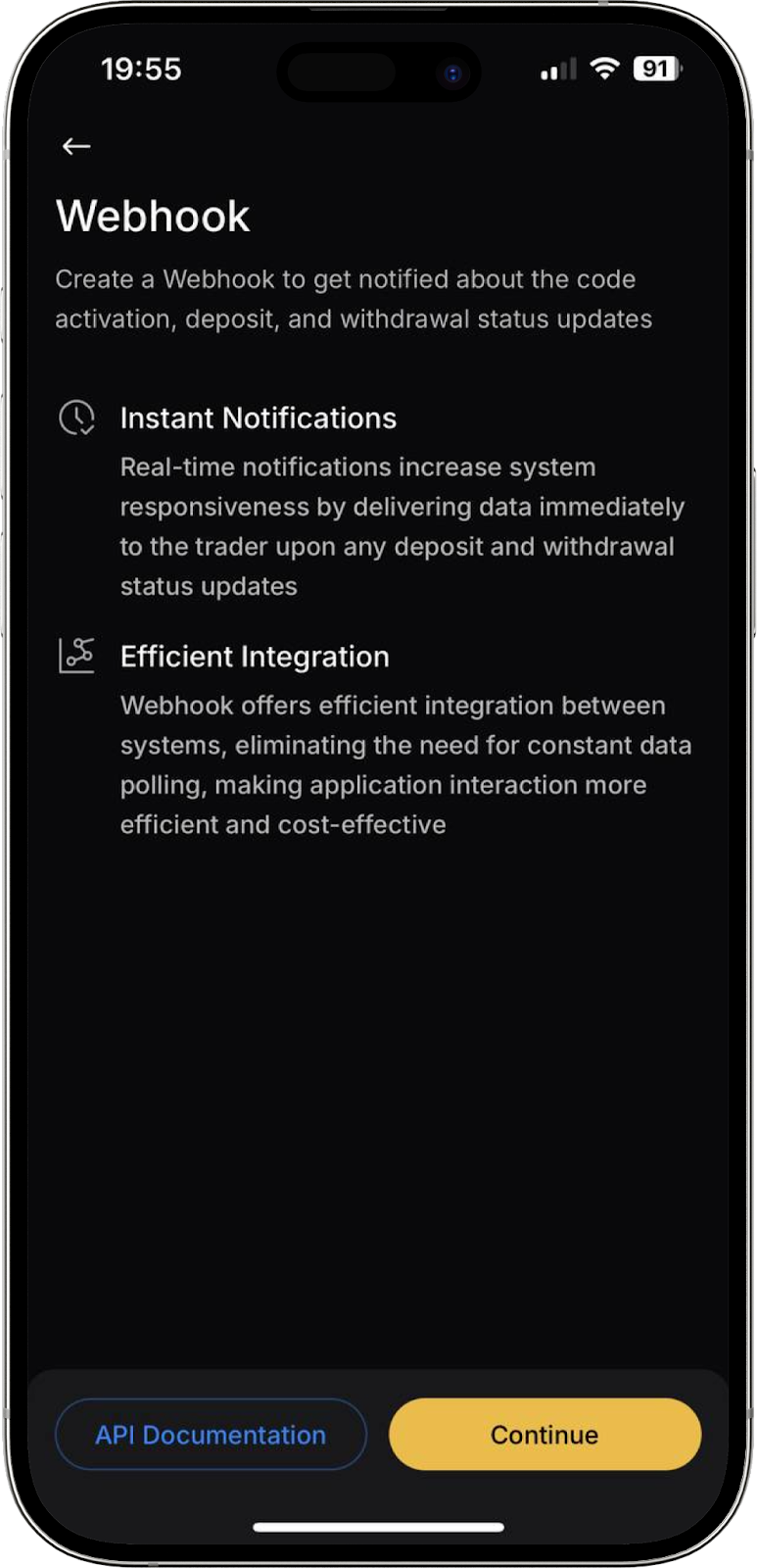 Funkcja umożliwia otrzymywanie powiadomień o aktywacji kodu lub potwierdzeniu zasilenia salda. Kliknij „Kontynuuj”. W otwartym oknie podaj adres webhooka i kliknij „Wygeneruj klucz”. Wpisz kod 2FA i kliknij „Potwierdź”. Gotowe!