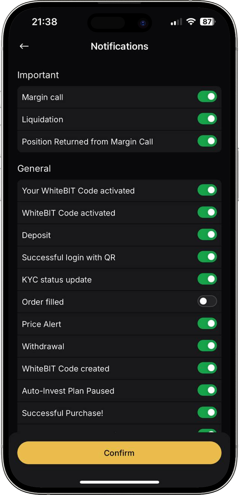 Tutaj możesz włączyć lub wyłączyć powiadomienia, które będą wyświetlane na twoim urządzeniu mobilnym, np. o likwidacji, realizacji zlecenia, aktywacji kodu WhiteBIT itp.