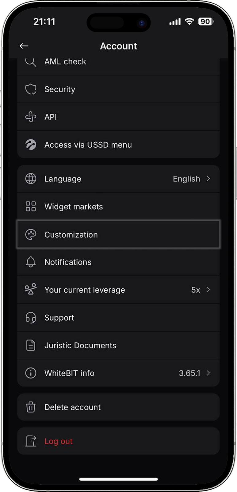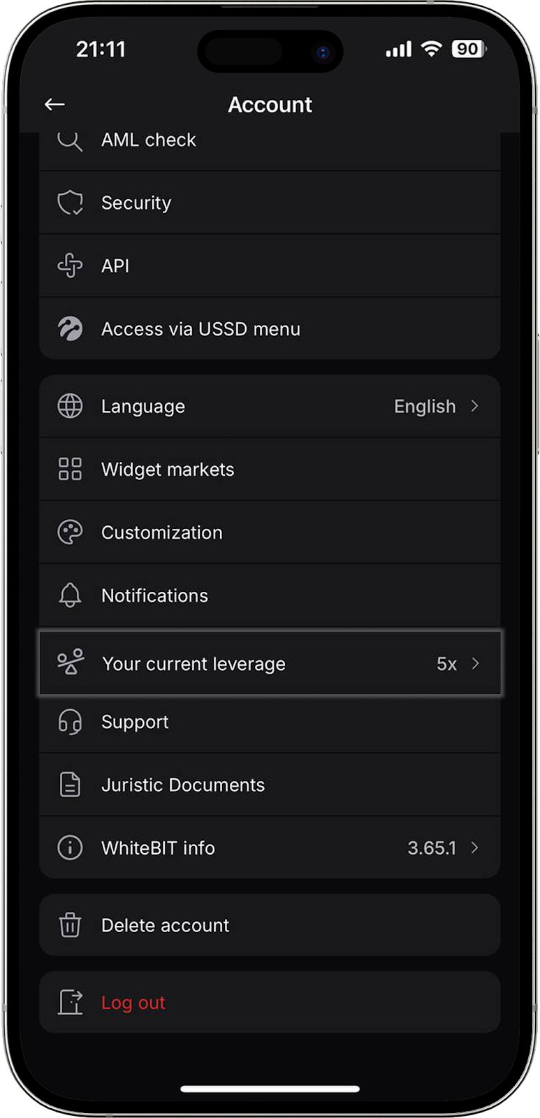 - Język, Widżety rynku, Customization, Powiadomienia, Twoja obecna dźwignia finansowa, Dział wsparcia, Dokumenty prawne, Informacje o WhiteBIT.