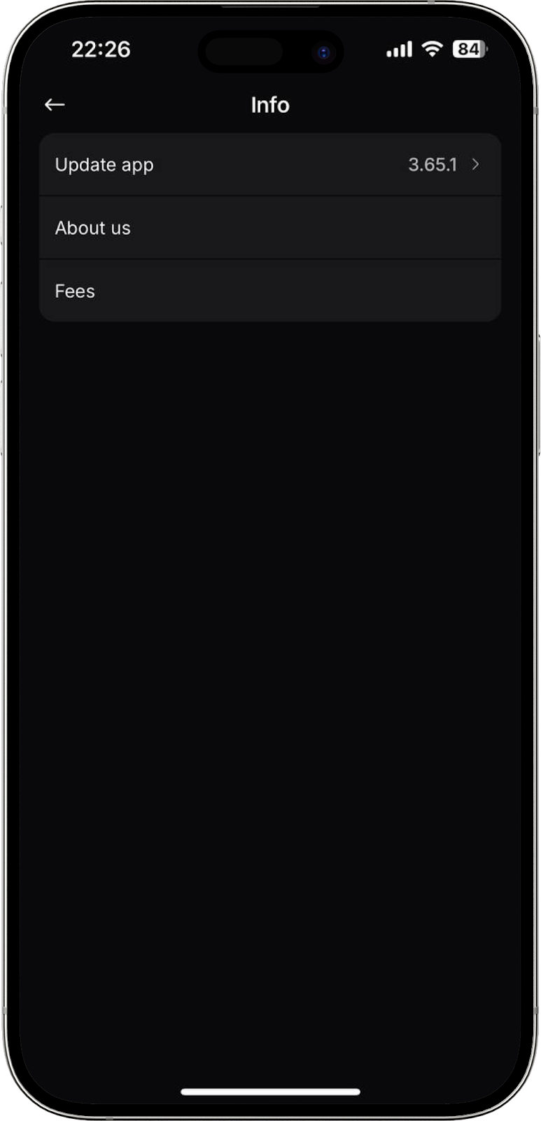 Tutaj możesz zaktualizować aplikację i sprawdzić jej aktualną wersję. Możesz także przejść do strony „O nas”, gdzie znajdziesz informacje o platformie, jej przeznaczeniu, misji, wartościach, bezpieczeństwie oraz partnerach. Dodatkowo dostępne są informacje o opłatach za wpłaty, wypłaty i handel.