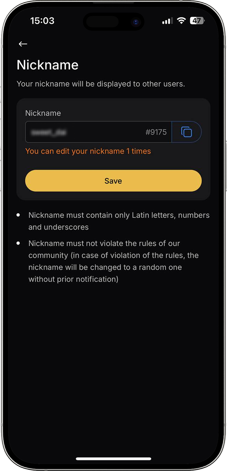 Aby zapewnić najwyższy poziom ochrony twoich danych osobowych, wprowadziliśmy system nicków, gdzie każdy użytkownik giełdy ma unikalny tag i numer. Nick składa się z dwóch części: losowej nazwy (przymiotnik + nazwa kryptowaluty) oraz czterocyfrowego tagu (np. #1111). Jeśli pierwsza część nicku może się powtarzać, tag liczbowy zapewnia jego unikalność. Aby zmienić nick, edytuj go w odpowiednim polu i kliknij „Zapisz”.