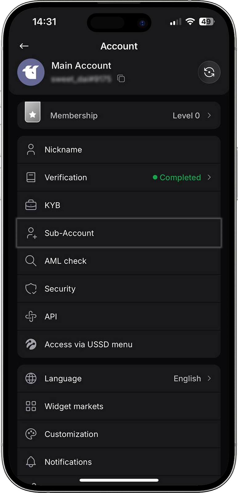W tym bloku możesz przełączać się między kontem głównym a subkontami. Masz też możliwość wyszukiwania konta po pseudonimie i przejścia do sekcji zarządzania subkontami. Ponadto możesz skopiować swój nick.