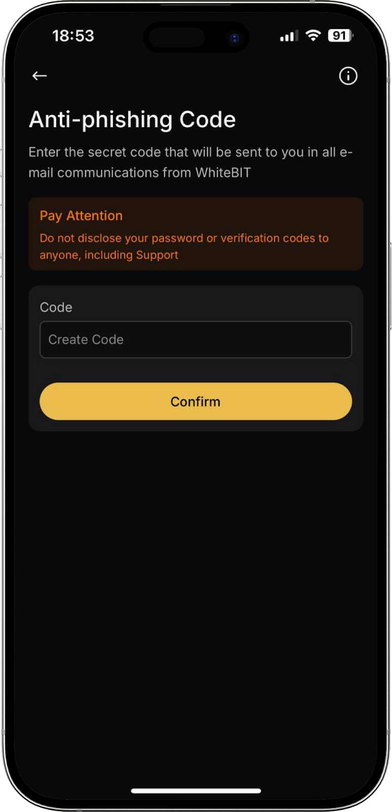 Po potwierdzeniu kodu antyphishingowego możesz zapobiec próbom phishingu z fałszywych stron WhiteBIT lub e-maili. Aby przejść do ustawień, kliknij „Kontynuuj”, wpisz kod i kliknij „Zapisz”. Aby potwierdzić operację, wpisz kod 2FA.