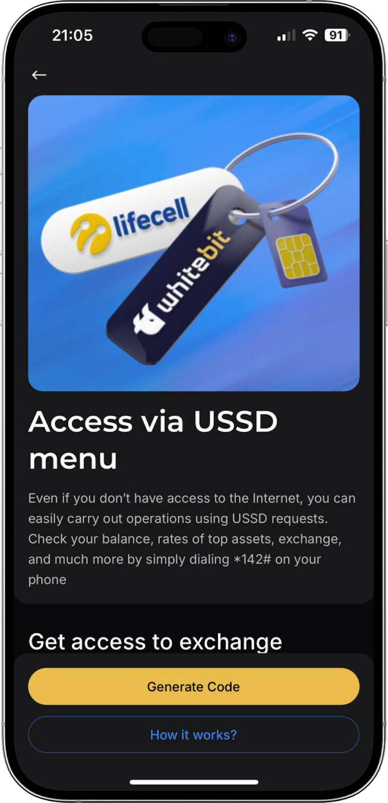 Funkcja menu USSD umożliwia dostęp do niektórych operacji na giełdzie WhiteBIT bez połączenia z internetem. Użytkownicy z Ukrainy korzystający z operatora lifecell mogą połączyć swoje konto z numerem lifecell i uzyskać dostęp do sprawdzania salda, transferów i wymiany środków, a także otrzymać adres do depozytu. Jeśli funkcja nie jest u ciebie włączona, kliknij „Utwórz kod”. Wpisz kod 2FA i postępuj zgodnie z instrukcjami.