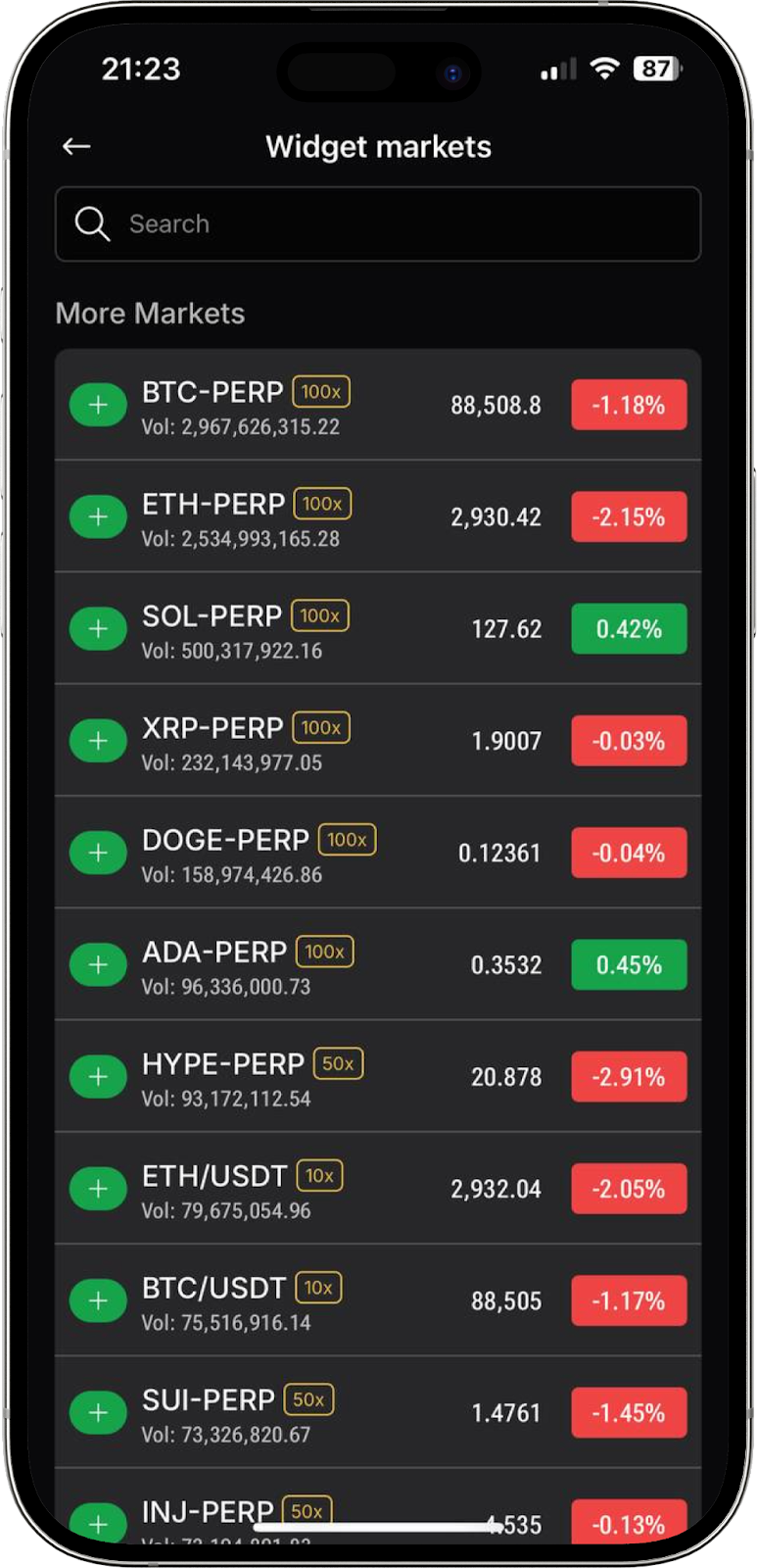 Tutaj możesz dodać widżet na ekran główny swojego urządzenia mobilnego. Dzięki temu możesz śledzić aktualny kurs kryptowalut bez logowania się na giełdę. Wybierz pary, które chcesz obserwować, klikając „+” po lewej stronie każdej z nich.