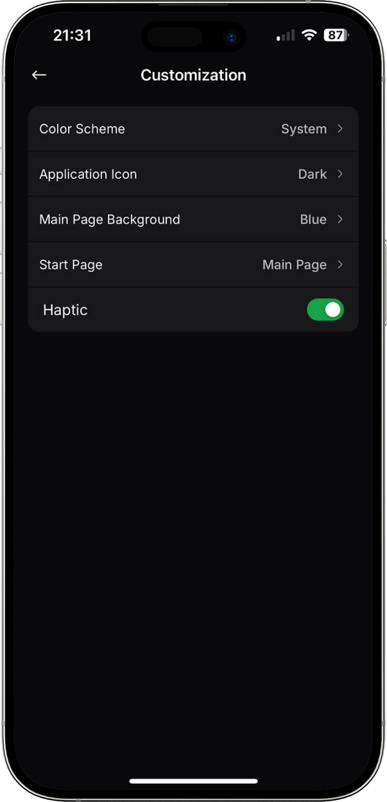 W tej sekcji możesz dostosować wygląd aplikacji mobilnej WhiteBIT. Możesz zmienić motyw (ciemny, jasny lub systemowy), kolor tła strony głównej, wybrać ikonę aplikacji oraz stronę startową (Główna, Handel lub Portfel), a także włączyć lub wyłączyć funkcję Haptic, która odpowiada za reakcję dotykową (wibracje podczas kliknięć, gestów itp.).