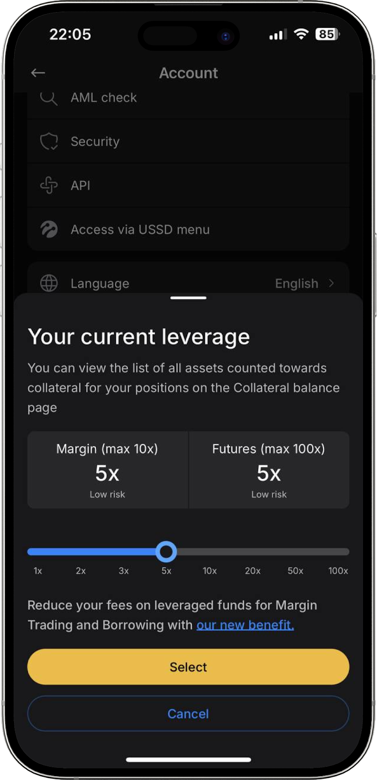 Dźwignia to stosunek środków pożyczonych do twoich środków używanych w handlu margin. W sekcji „Konto” możesz nią zarządzać. Kliknij „Bieżąca dźwignia”, wybierz wartość suwakiem i kliknij „Wybierz”.