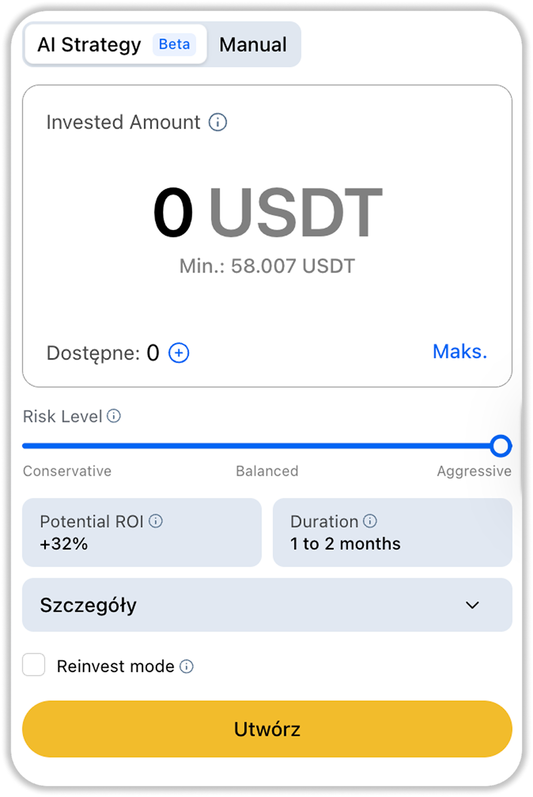 Prosty lub zaawansowany start: Możesz skonfigurować Grid Bota Spot na dwa sposoby – w trybie AI dla szybkiego startu lub w trybie ręcznym dla pełnej kontroli. W trybie AI od ciebie wymaga się jedynie wybrania poziomu ryzyka (np. Konserwatywny, Zrównoważony, Agresywny) i trybu reinwestycji zysków; system automatycznie dobierze optymalne parametry: zakres cen, liczbę poziomów w siatce, kwotę inwestycji itd. Ten tryb jest idealny dla początkujących, ponieważ pokazuje nawet prognozowany ROI i przybliżony czas działania strategii na podstawie danych historycznych.
