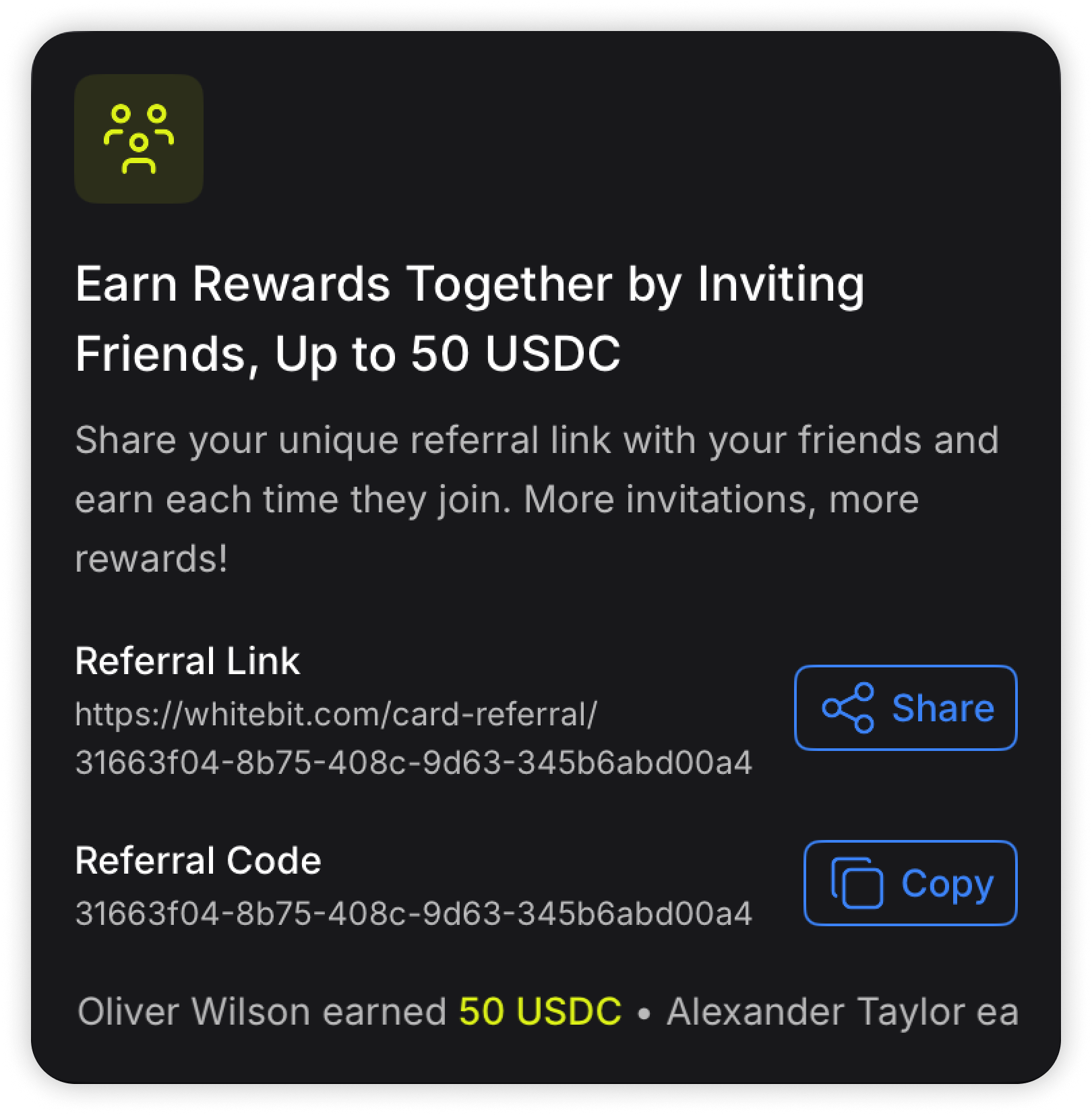 Ponadto każda osoba, która złoży wniosek o kartę WhiteBIT Nova za pomocą linku od obecnego posiadacza karty w ramach programu „Zaproś znajomych”, również otrzyma bonus w wysokości 1 USDC. Informacje o znajomych, którzy złożyli wniosek o kartę za pomocą twojego linku polecającego, będą wyświetlane w zakładce ogólnego salda karty na dole, w sekcji programu referencyjnego.