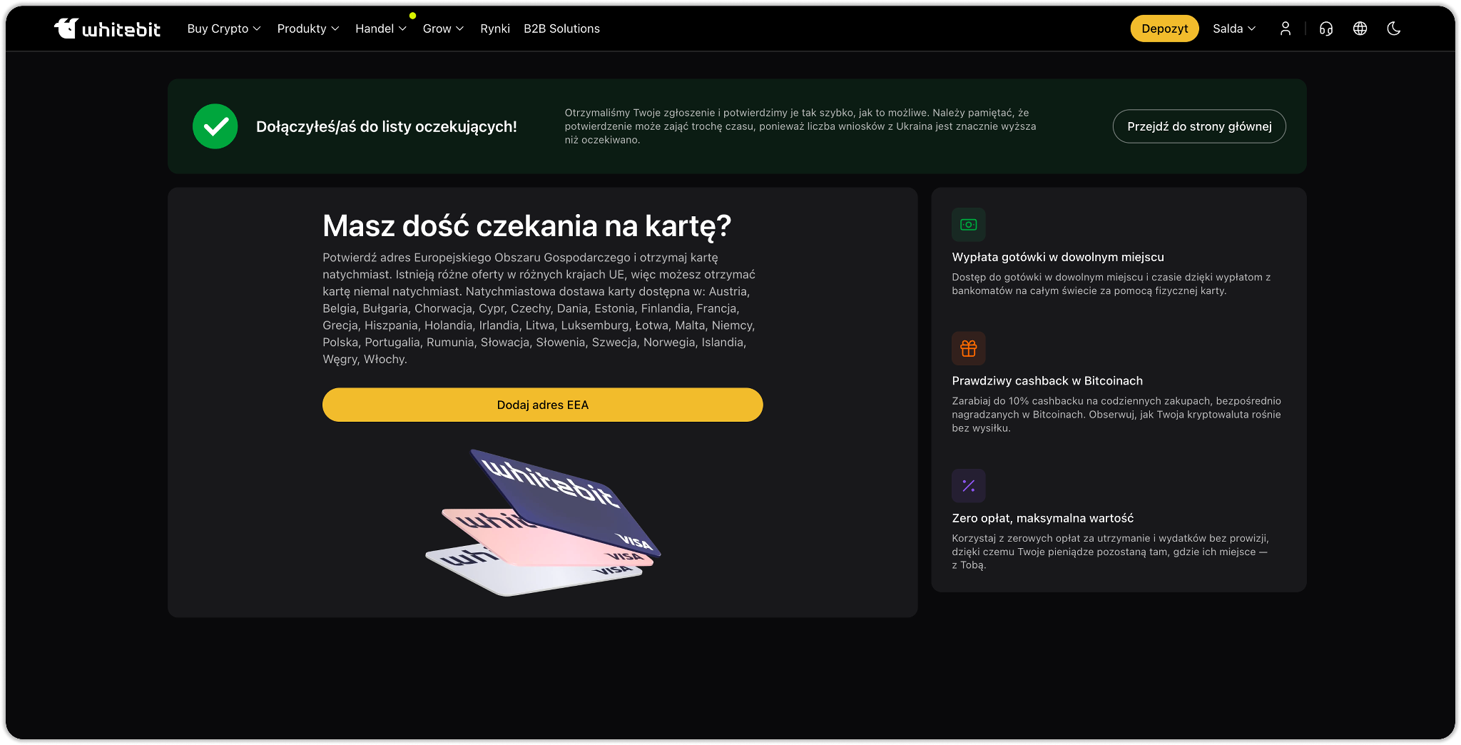 1. Jeśli nie jesteś rezydentem Europejskiego Obszaru Gospodarczego, twój wniosek zostanie dodany do listy oczekujących (obecnie brak określonych terminów oczekiwania na kartę WhiteBIT Nova). Możesz jednak podać adres w EOG i natychmiast otrzymać kartę.