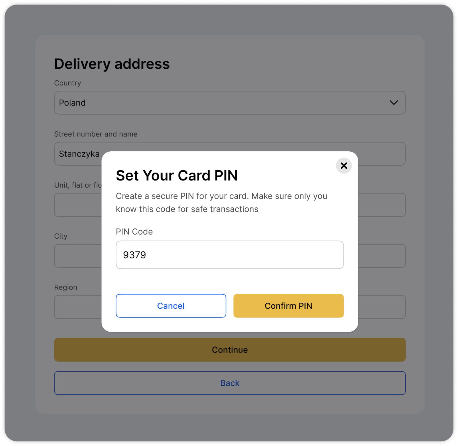 1. Ustaw kod PIN i kliknij „Potwierdź PIN”. W przypadku karty cyfrowej wprowadź i potwierdź swój numer telefonu za pomocą kodu SMS, a następnie kliknij „Kontynuuj”.
