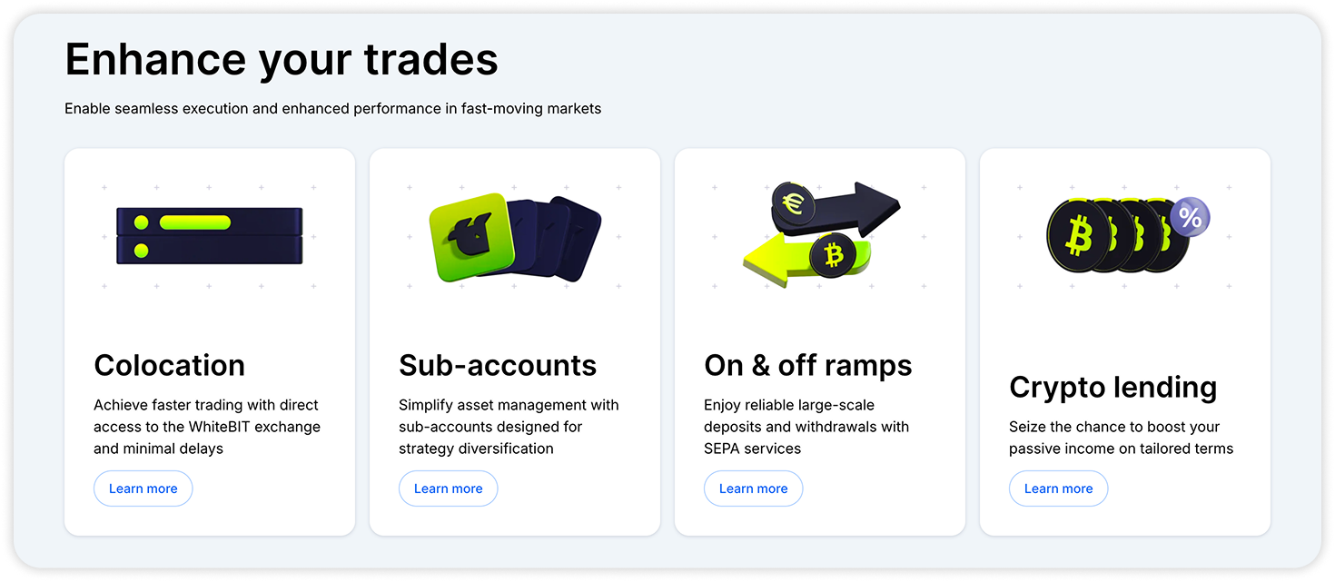 WhiteBIT oferuje specjalistyczną infrastrukturę dostosowaną do potrzeb handlu wysokich częstotliwości dla firm HFT. Główny nacisk kładzie się na minimalizację opóźnień, bezpieczeństwo i skalowalność.