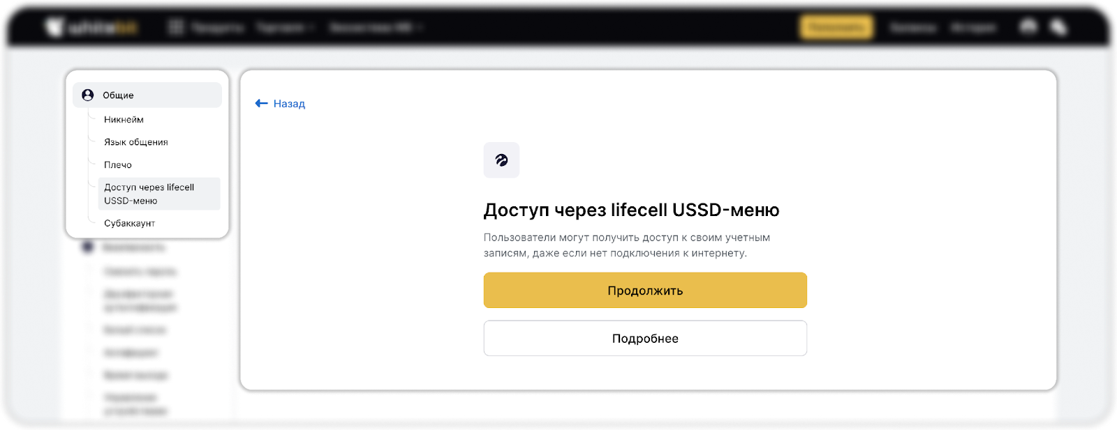 Функция USSD-меню позволяет получить доступ к некоторым операциям на бирже WhiteBIT без подключения к Интернету. Пользователи из Украины, которые пользуются услугами мобильного оператора lifecell, могут подключить свою учетную запись на бирже к номеру lifecell и иметь доступ к просмотру баланса, трансферу и обмену средств, а также получению адреса для депозита. Если эта функция у вас не подключена, нажмите “Доступ через lifecell USSD-меню”-“Редактировать”, затем “Продолжить”. Введите код 2FA, и следуйте инструкции.
