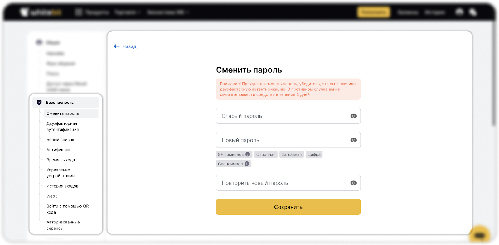 Обратите внимание: В случае, если вы сменили пароль и 2FA была выключена на вашей учетной записи, вы не сможете совершить вывод средств в течение 72 часов.