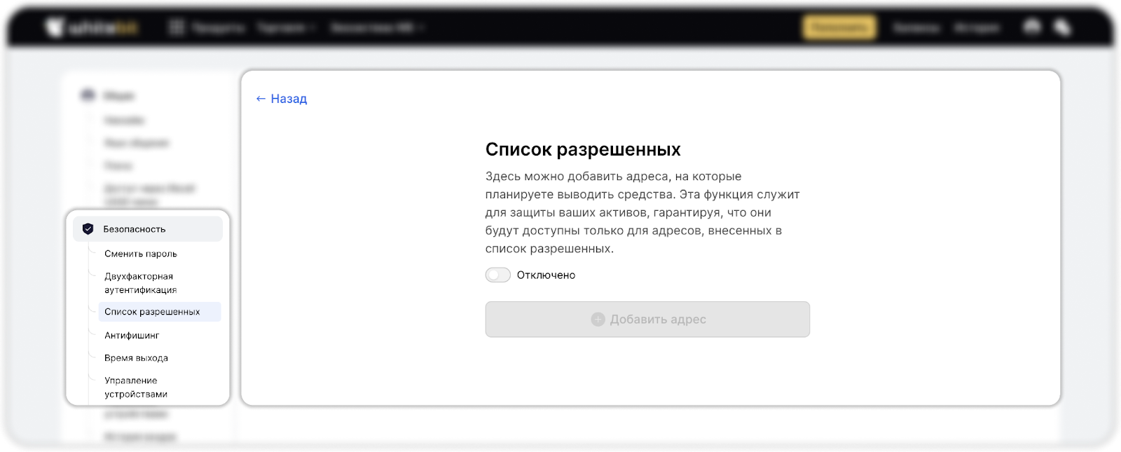 В данном разделе вы можете добавлять адреса, которые вы используете для вывода средств, в список разрешенных. Чтобы добавить новый адрес, нажмите “Редактировать”. Функция списка разрешенных помогает защитить ваши средства, позволяя выводить их только на адреса из этого списка. То есть, если вы добавляете адрес в список разрешенных, то выводить средства сможете только на него. Чтобы включить или выключить функцию списка разрешенных, нужно указывать код двухфакторной аутентификации.