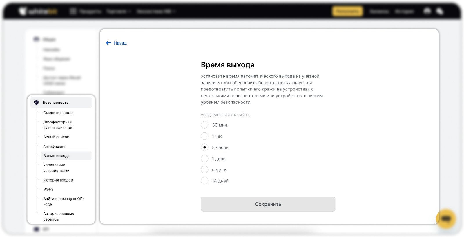 В этом блоке можно установить время автоматического выхода из учетной записи в условиях отсутствия активности. Если вы зашли в учетную запись и забыли выйти, функция закроет доступ к учетной записи для устройства, с которого вы выполнили вход. Доступные временные промежутки - 30 минут, 1 час, 8 часов, 1 день, 7 дней, 14 дней.