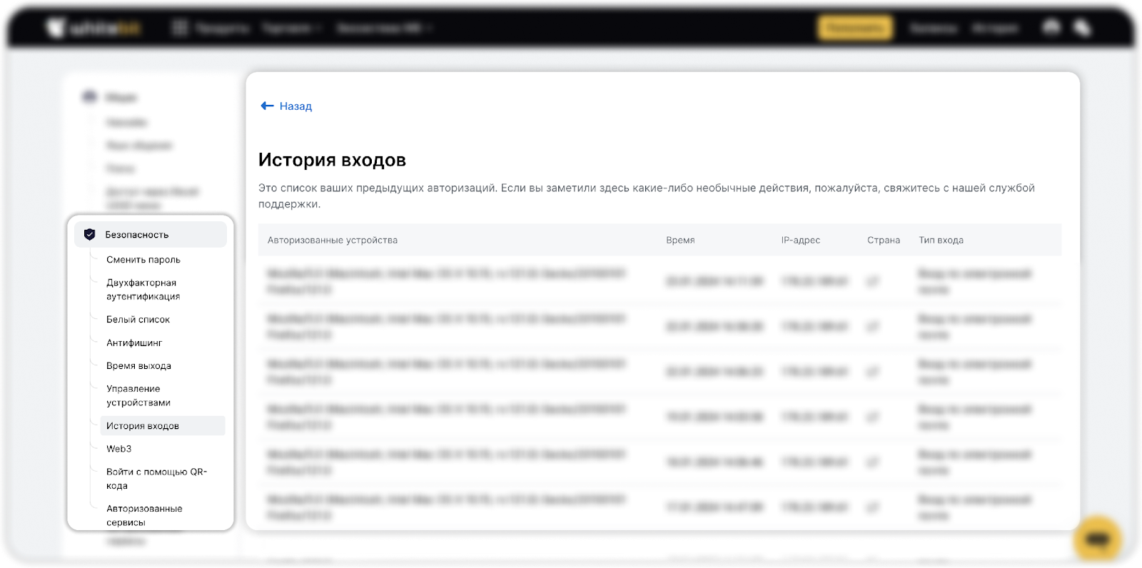 В данной вкладке отображается история входов в вашу учетную запись со всех устройств.