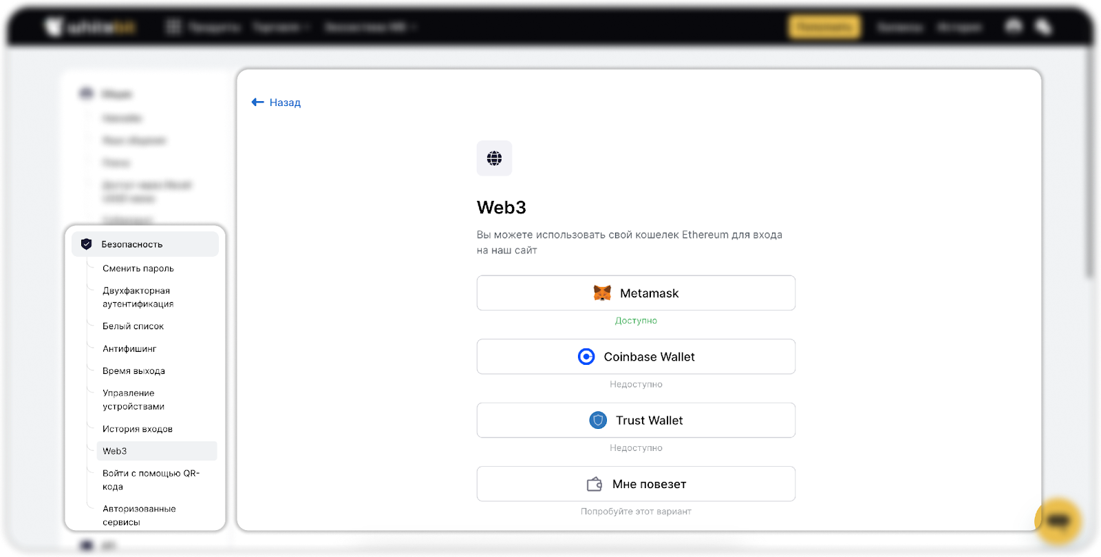 Авторизоваться на WhiteBIT можно еще с помощью Web3-кошелька. Чтобы воспользоваться этой функцией, нужно установить расширение для своего кошелька в браузере и включить двухфакторную аутентификацию на бирже. В блоке “Web3” найдите в списке необходимый вам кошелек. В случае, если именно вашего кошелька нет в списке, нажмите “Мне повезет”, что позволит системе обнаружить расширение кошелька, подключенное к вашему браузеру.