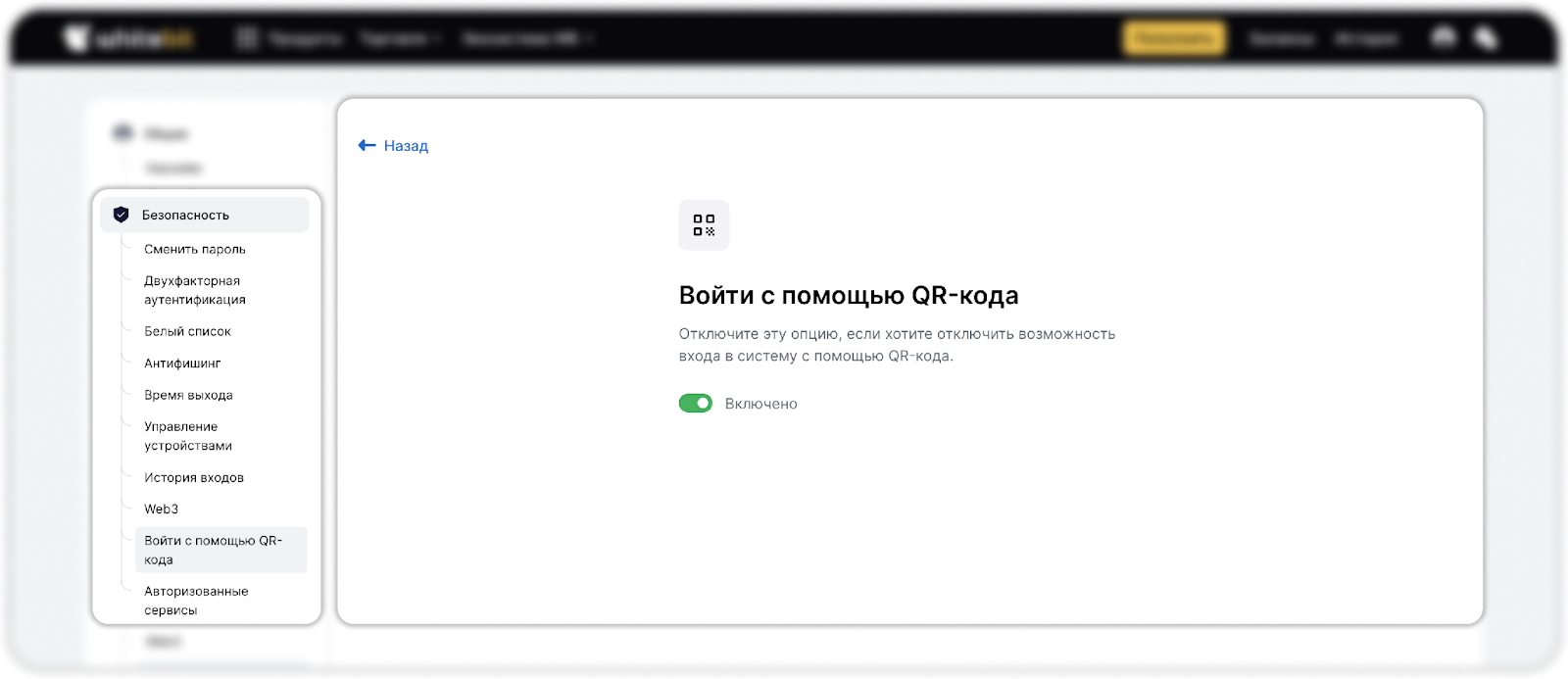 Еще один удобный метод входа на биржу для пользователей нашего мобильного приложения. Теперь вы можете заходить в свой профиль в веб-версии биржи с помощью QR-кода. В этом блоке можно включить или выключить функцию.