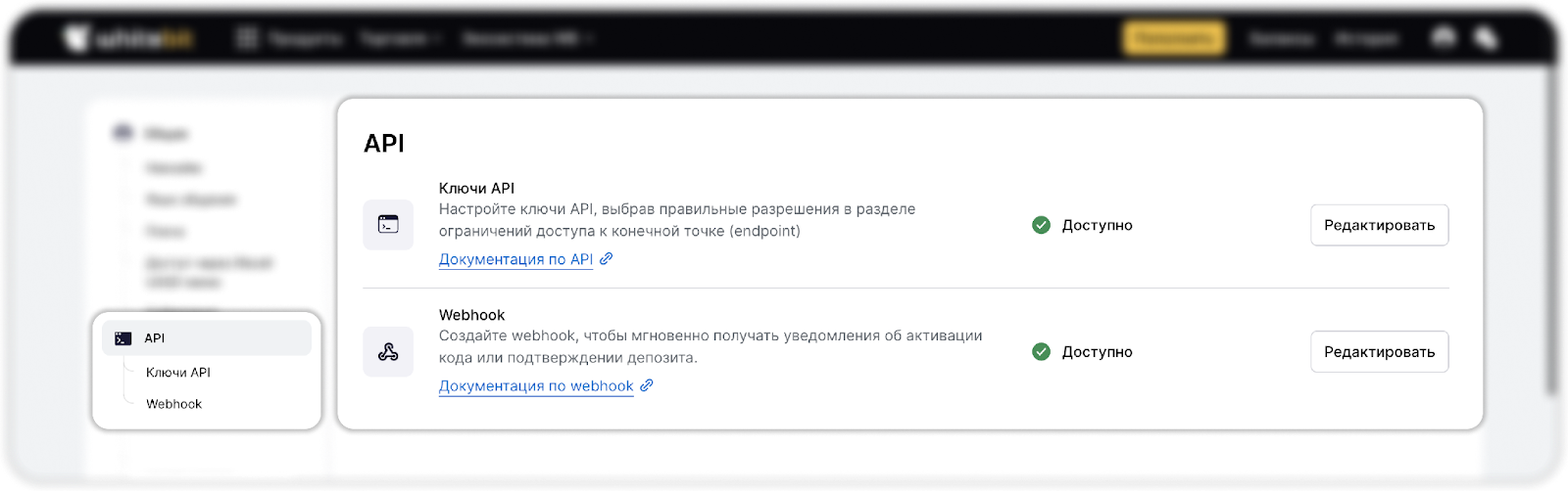Функция позволяет получать уведомления об активации кода или подтверждении пополнения баланса. Нажмите “Webhook”-“Редактировать” и “Продолжить”. В открывшемся окне укажите адрес webhook и нажмите “Сгенерировать ключ”. Введите код 2FA и нажмите “Подтвердить”. Готово!