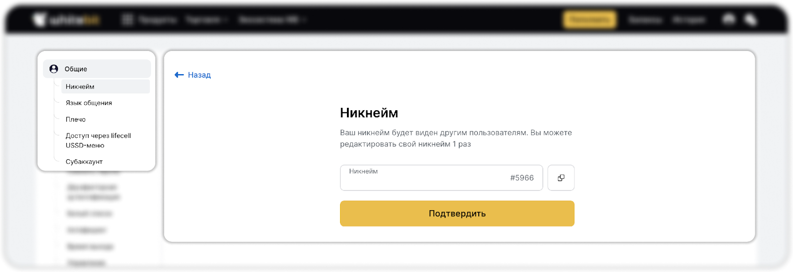 Для обеспечения высокого уровня защиты ваших персональных данных мы внедрили систему никнеймов, где каждый пользователь биржи имеет уникальный тег и номер. Никнейм состоит из двух частей: случайное имя (прилагательное + название криптовалюты) и тег из четырех цифр (например, #1111). Если первая часть никнейма пользователей может совпадать, то с помощью числового тега он будет уникализован. Чтобы просмотреть свой никнейм или изменить его, нажмите “Редактировать” напротив поля “Никнейм”, введите новый никнейм и нажмите “Подтвердить”.