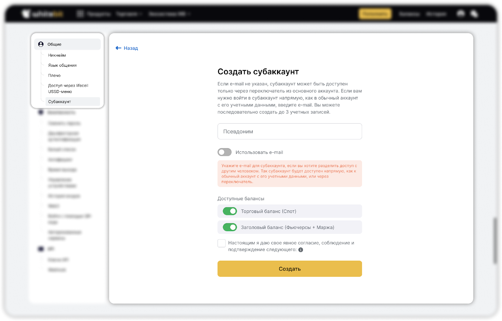 Пользователь имеет возможность добавить до 10 Субаккаунтов к своему профилю, что упрощает организацию и реализацию многочисленных торговых стратегий. Это позволяет сохранять и диверсифицировать средства Главного аккаунта и одновременно испытывать различные торговые стратегии.