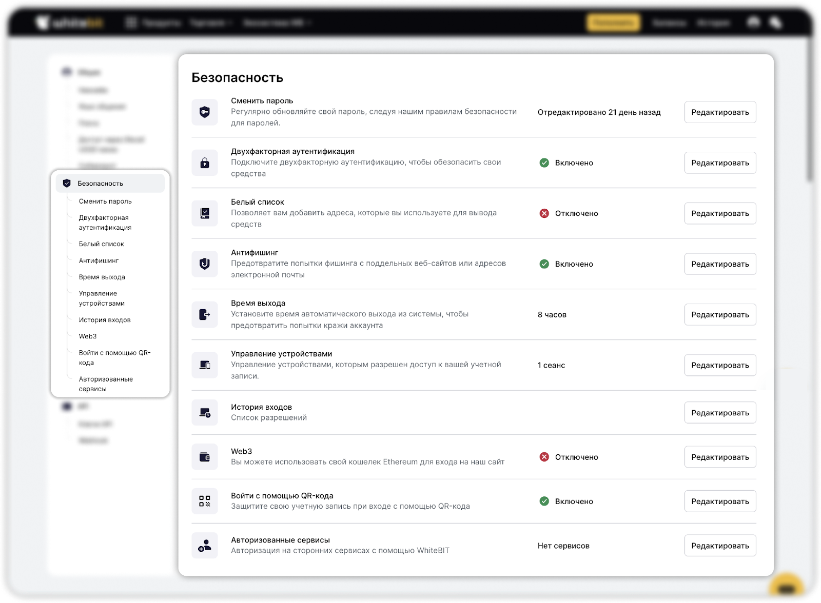 В этом разделе можно управлять настройками безопасности учетной записи, такими как смена пароля, управление адресами, активация двухфакторной аутентификации и другими.