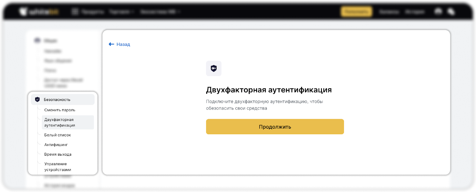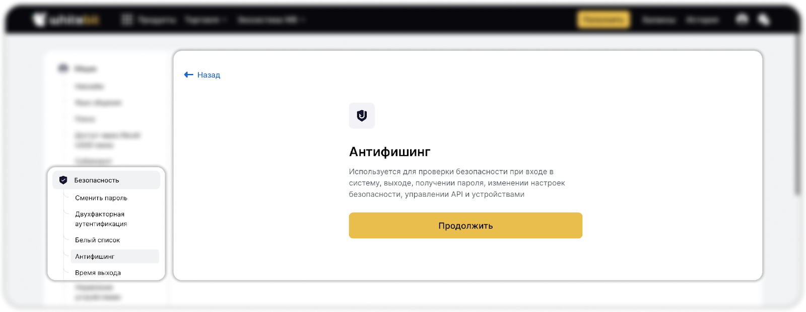 Подтвердив свой антифишинговый код, вы сможете предотвратить попытки фишинга с поддельных веб-сайтов WhiteBIT или e-mail. Чтобы перейти к настройкам, нажмите “Редактировать”-“Продолжить”, укажите код и нажмите “Сохранить”. Чтобы подтвердить операцию, введите код 2FA.