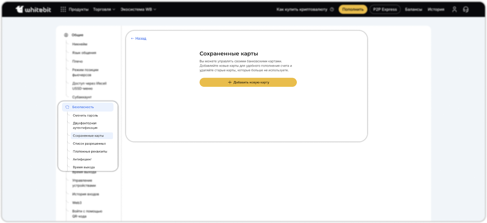 В этом разделе вы можете управлять своими банковскими картами. Есть возможность добавлять новые карты (кнопка “Добавить новую карту”) для удобного пополнения счета и удалять старые карты (кнопка “Удалить”), которыми вы больше не пользуетесь.