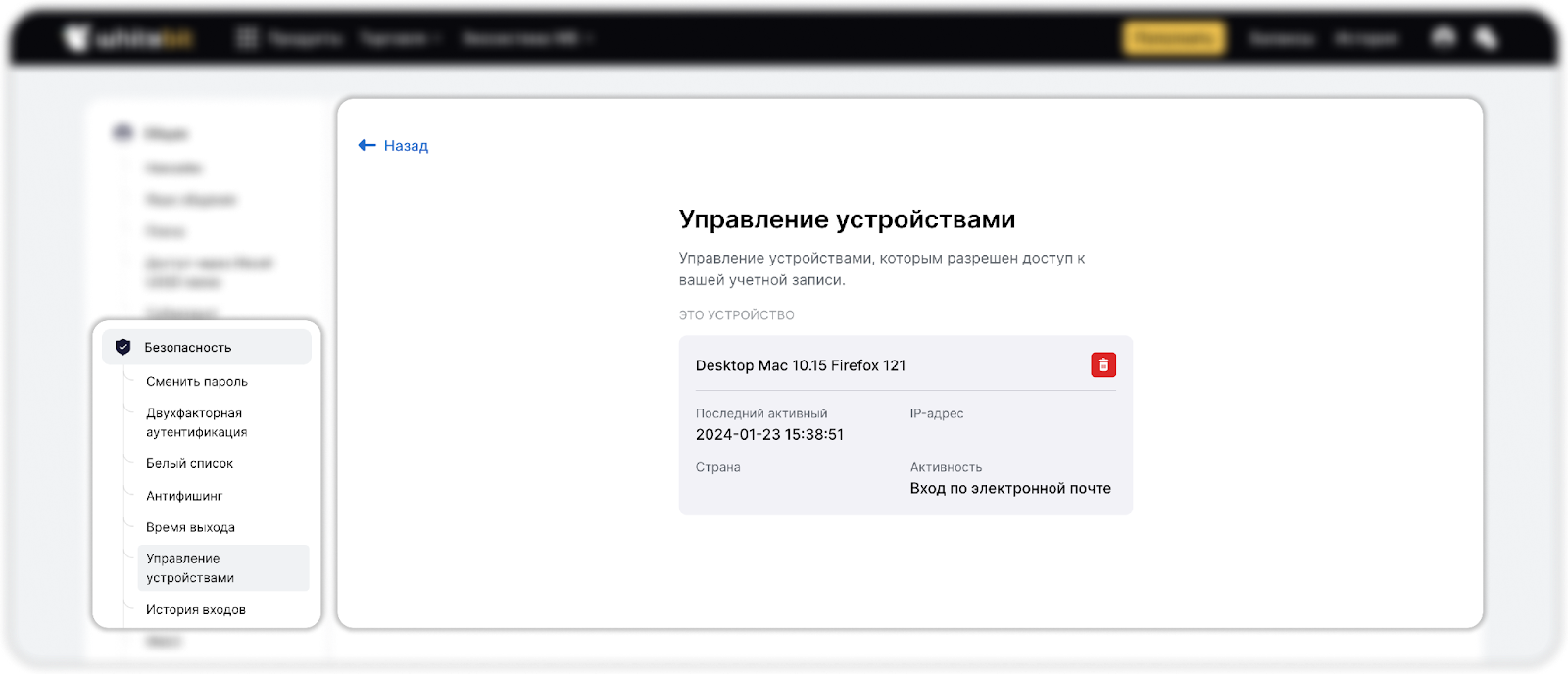 Вы можете заходить в учетную запись с разных устройств, включая мобильные телефоны, планшеты и другие компьютеры. В разделе “Управление устройствами” вы можете отменить как одну конкретную сессию, нажав на символ корзины в правом верхнем углу определенного блока, так и все активные сессии со всех устройств одновременно, нажав “Удалить все” в правом верхнем углу.