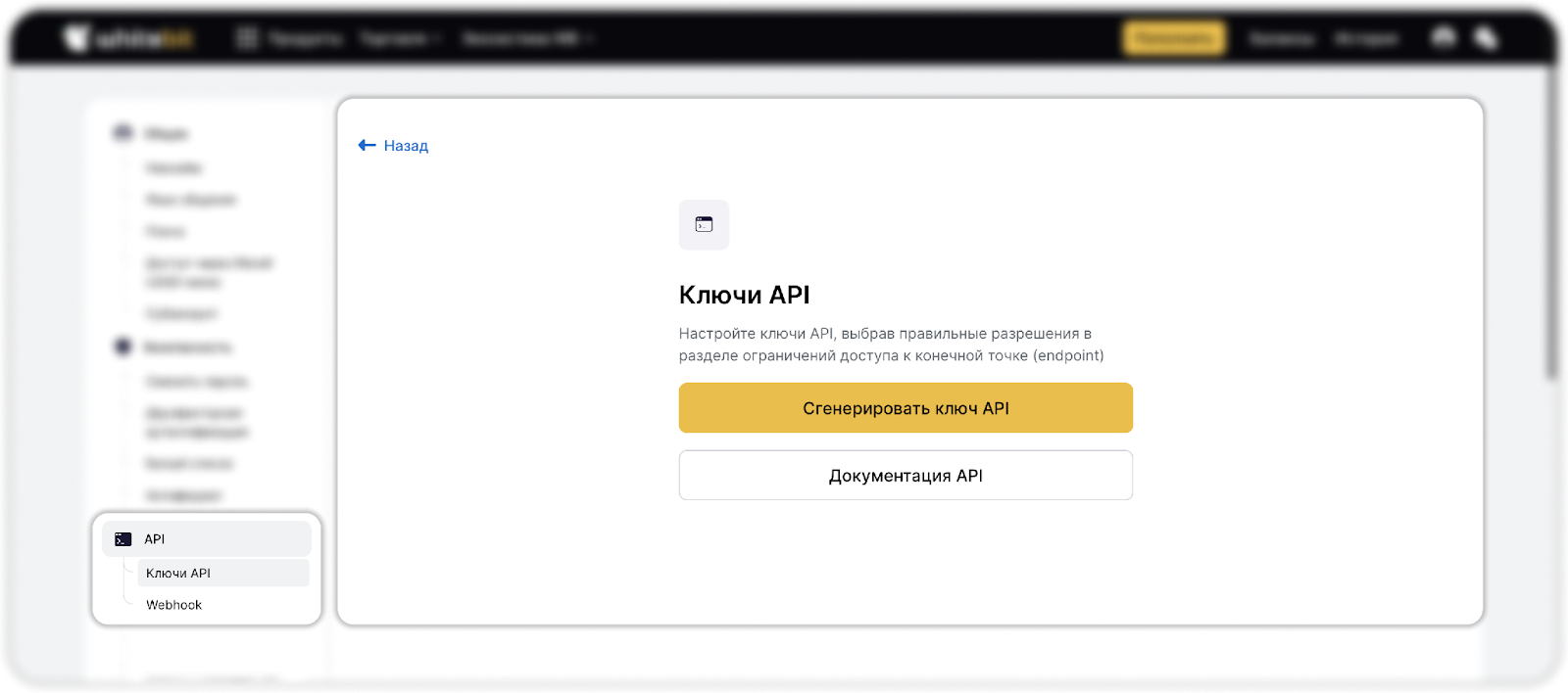 В этом разделе можно сгенерировать API-ключ и настроить его, выбрав правильные доступы в разделе ограничений доступа к конечной точке (endpoint). Чтобы создать ключ, нажмите “Редактировать”-“Сгенерировать ключ API”, введите код 2FA, придумайте название для ключа, активируйте нужные доступы и нажмите “Подтвердить”.