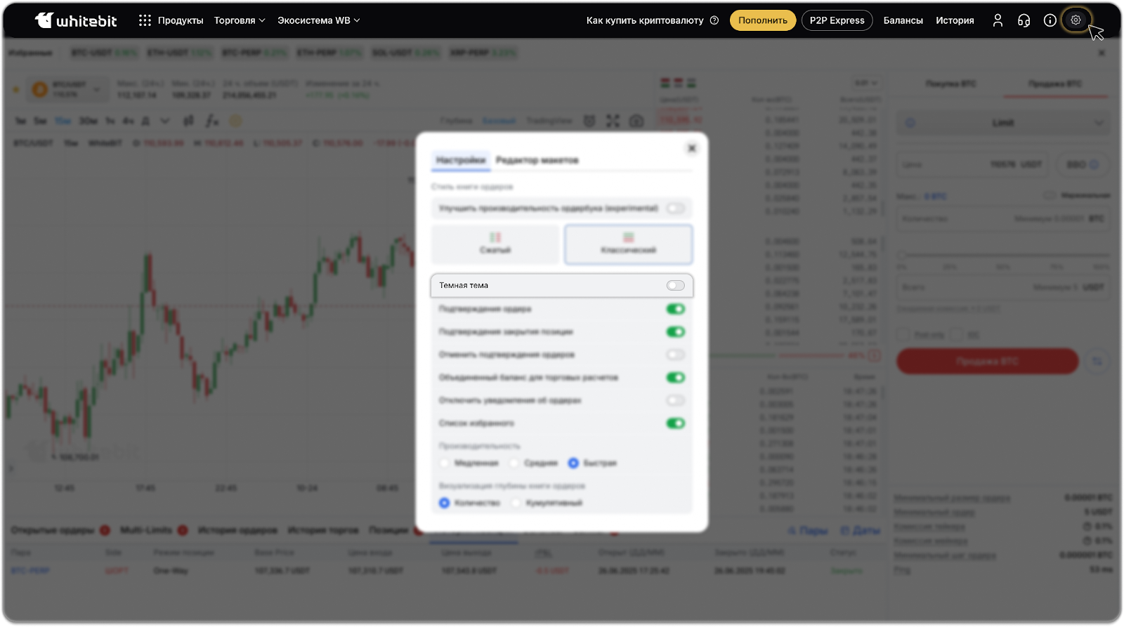 Вы также можете выбрать темную тему для торгового терминала, нажав на значок шестеренки в правом верхнем углу.