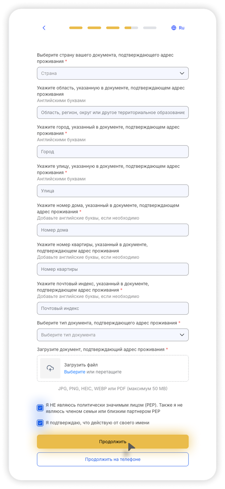 В рамках этой проверки необходимо заполнить форму с актуальными адресными данными на английском языке, выбрать тип документа, подтверждающего адрес (например, банковская выписка, счёт за коммунальные услуги и др.), а также загрузить соответствующий файл.