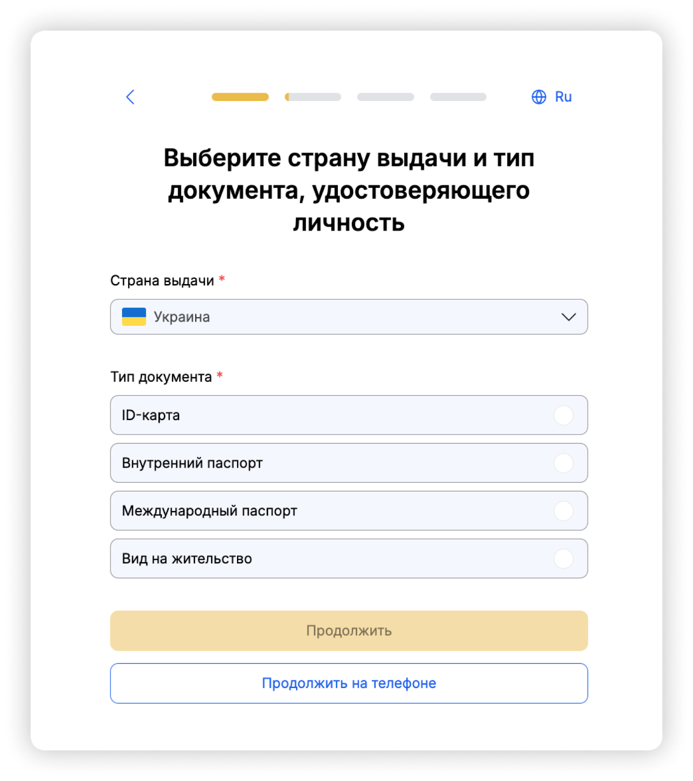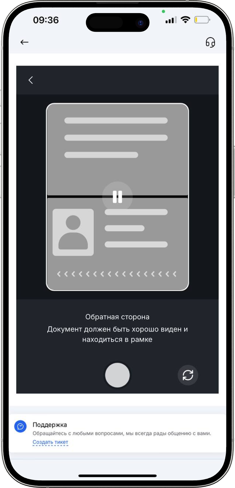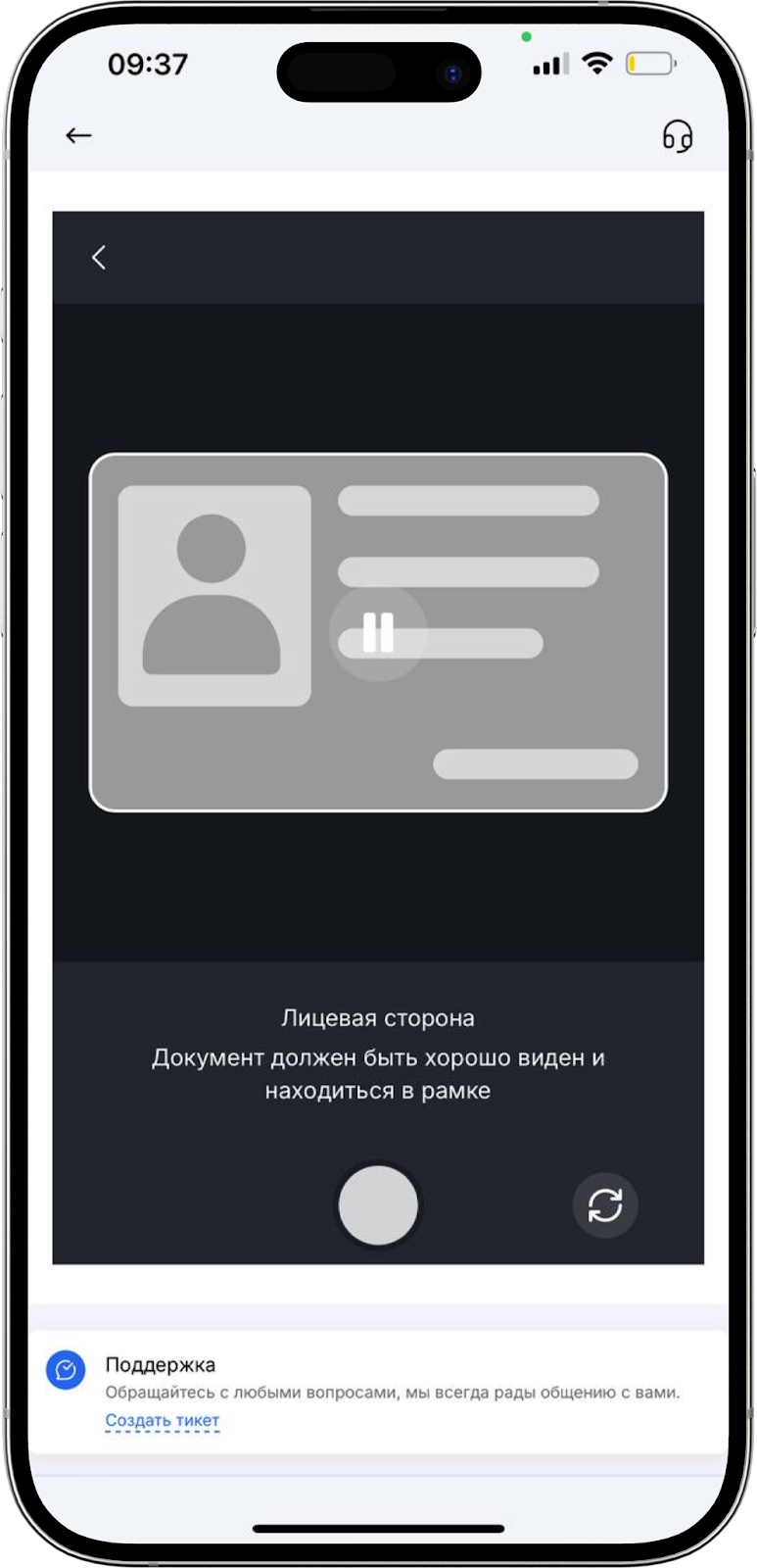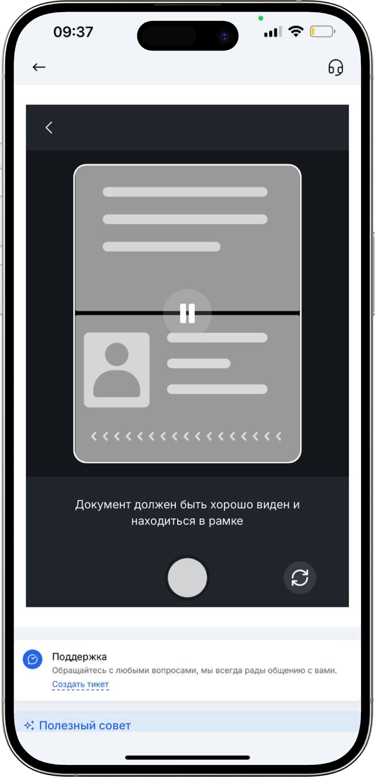Доступны 4 варианта: ID-карта, внутренний паспорт, международный паспорт или вид на жительство. Выберите наиболее удобный способ и сфотографируйте документ.
