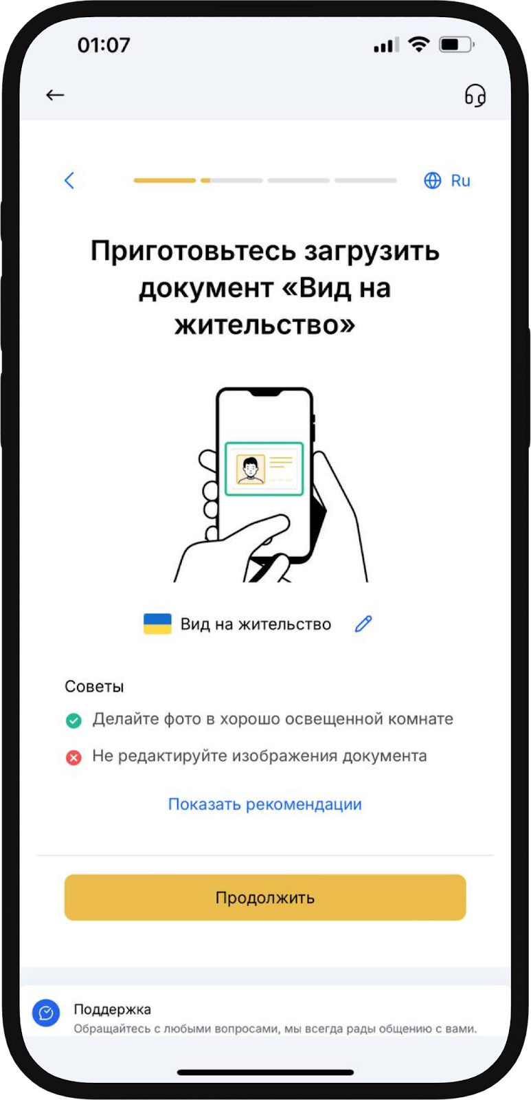 Доступно 3 варианта: ID-карта, паспорт или вид на жительство. Выберите самый удобный способ и сфотографируйте документ.