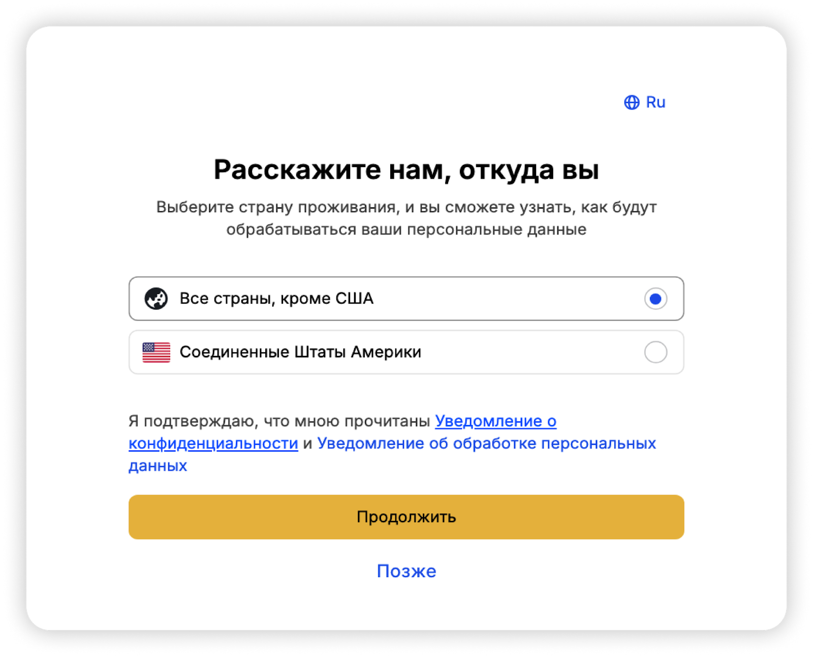 В настоящее время мы не принимаем документы, удостоверяющие личность, от граждан или резидентов следующих стран и территорий: Афганистан, Американское Самоа, Виргинские острова США, Великобритания, Гуам, Иран, Ливия, Государство Палестина, Пуэрто-Рико, Сомали, Корейская Народно-Демократическая Республика, Северные Марианские острова, Соединённые Штаты Америки, Сирия, Республика Беларусь, Российская Федерация, Республика Судан, Йемен, Канада, Приднестровье, временно оккупированные территории Грузии, Турецкая Республика Северного Кипра, Западная Сахара, Федеративная Республика Амбазония, Косово, Южный Судан, Тринидад и Тобаго, Венесуэла, Мьянма и временно оккупированные территории Украины.