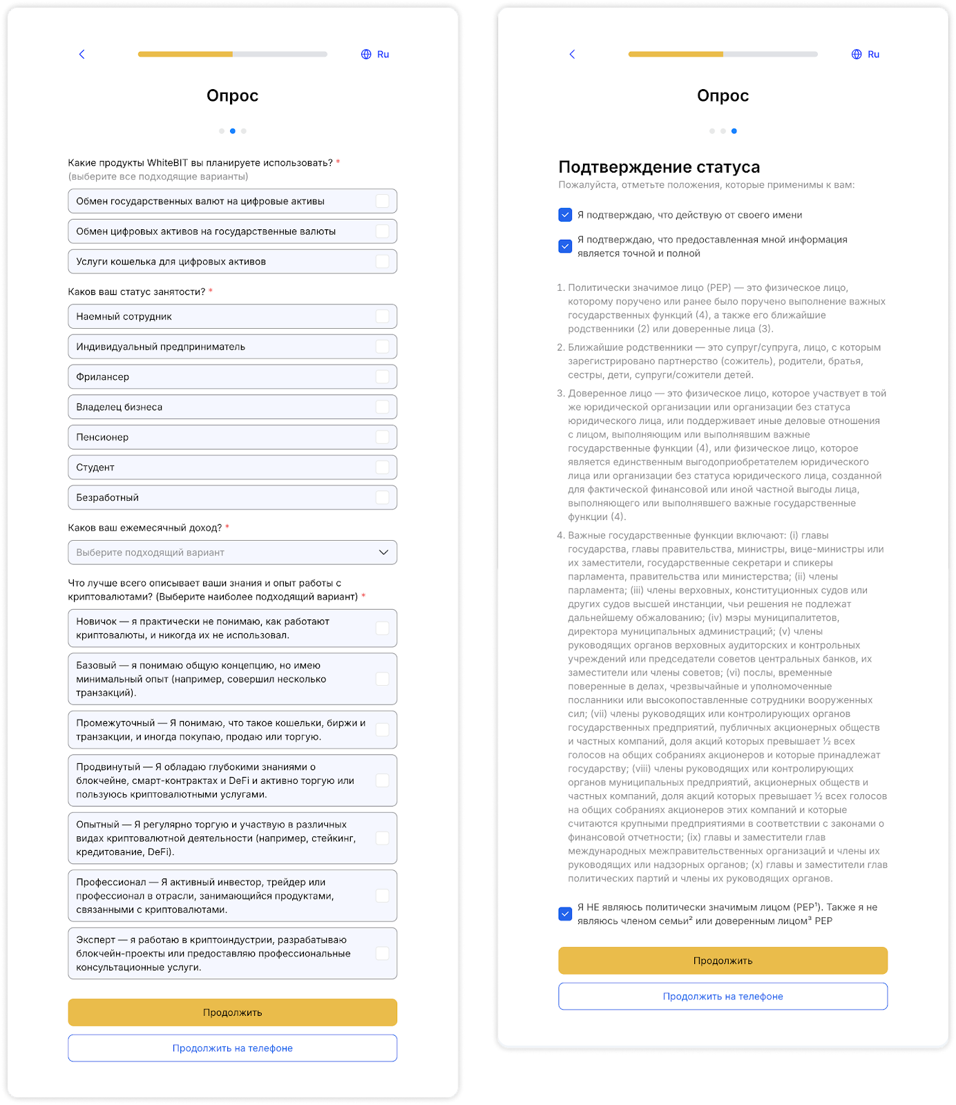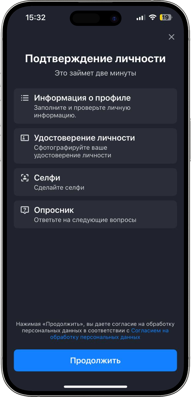 Для продолжения процедуры верификации вам нужно подтвердить соответствие нескольким пунктам Пользовательского соглашения. Чтобы сделать это — просто проставьте галочки в соответствующих места.